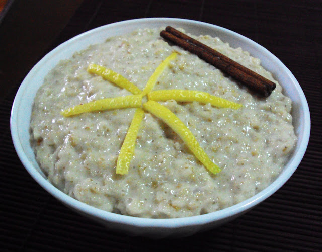 Quando a consistência for cremosa e idêntica ao arroz doce, retire do lume. Remova o pau de canela e a casca de limão. Rectifique o açúcar e a canela. Coloque numa tigela e sirva. Decore a gosto (pode polvilhar com canela).