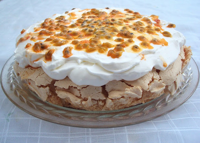 A pavlova ficou excelente e de maracujá mesmo ao meu gosto.