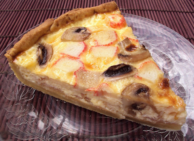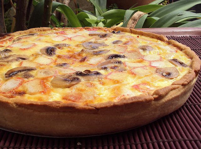 Dentro da tarteira, já forrada, espalhe o queijo, os cogumelos e as delícias. Bata os ovos com o leite/natas e tempere com sal e pimenta moída na ocasião. Verta este preparado sobre a quiche.
