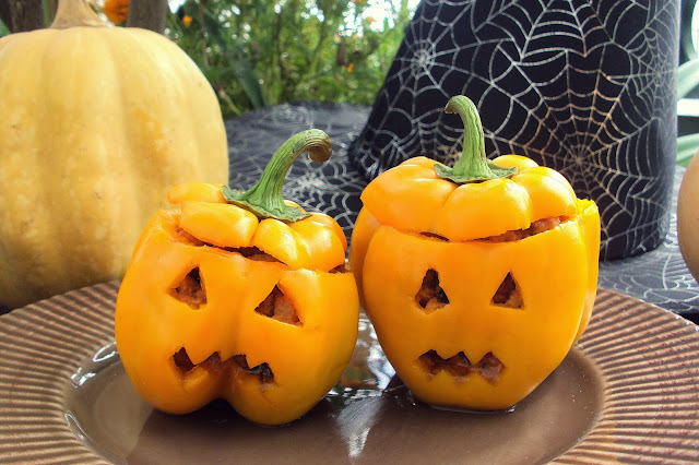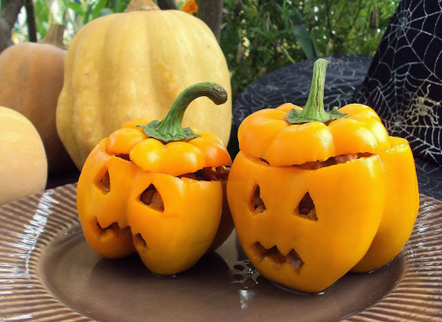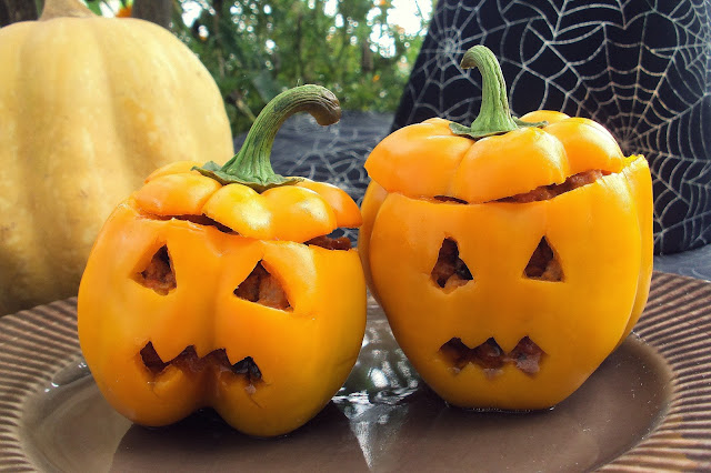 Em seguida, recorte, usando uma faca, uma das faces do pimento, dando-lhe o aspeto de uma abóbora de halloween (fazendo-lhe olhos e boca). Tempere o interior do pimento com sal e um unte-o, ligeiramente, com azeite.