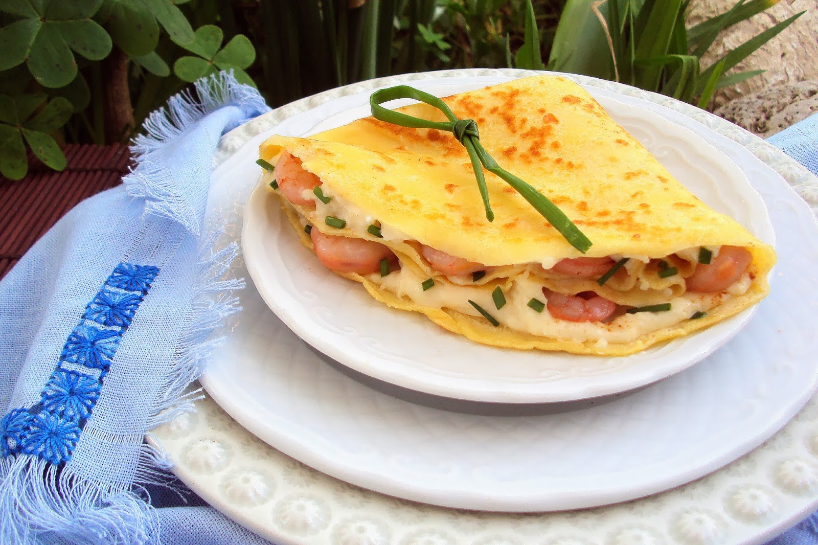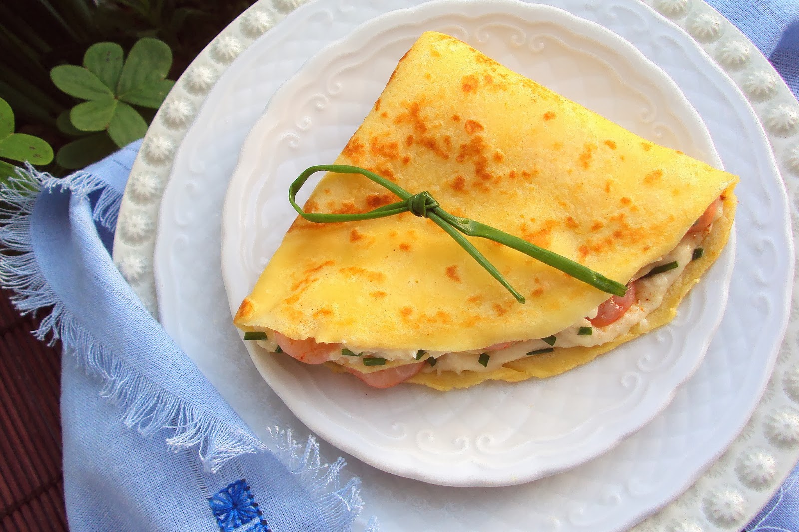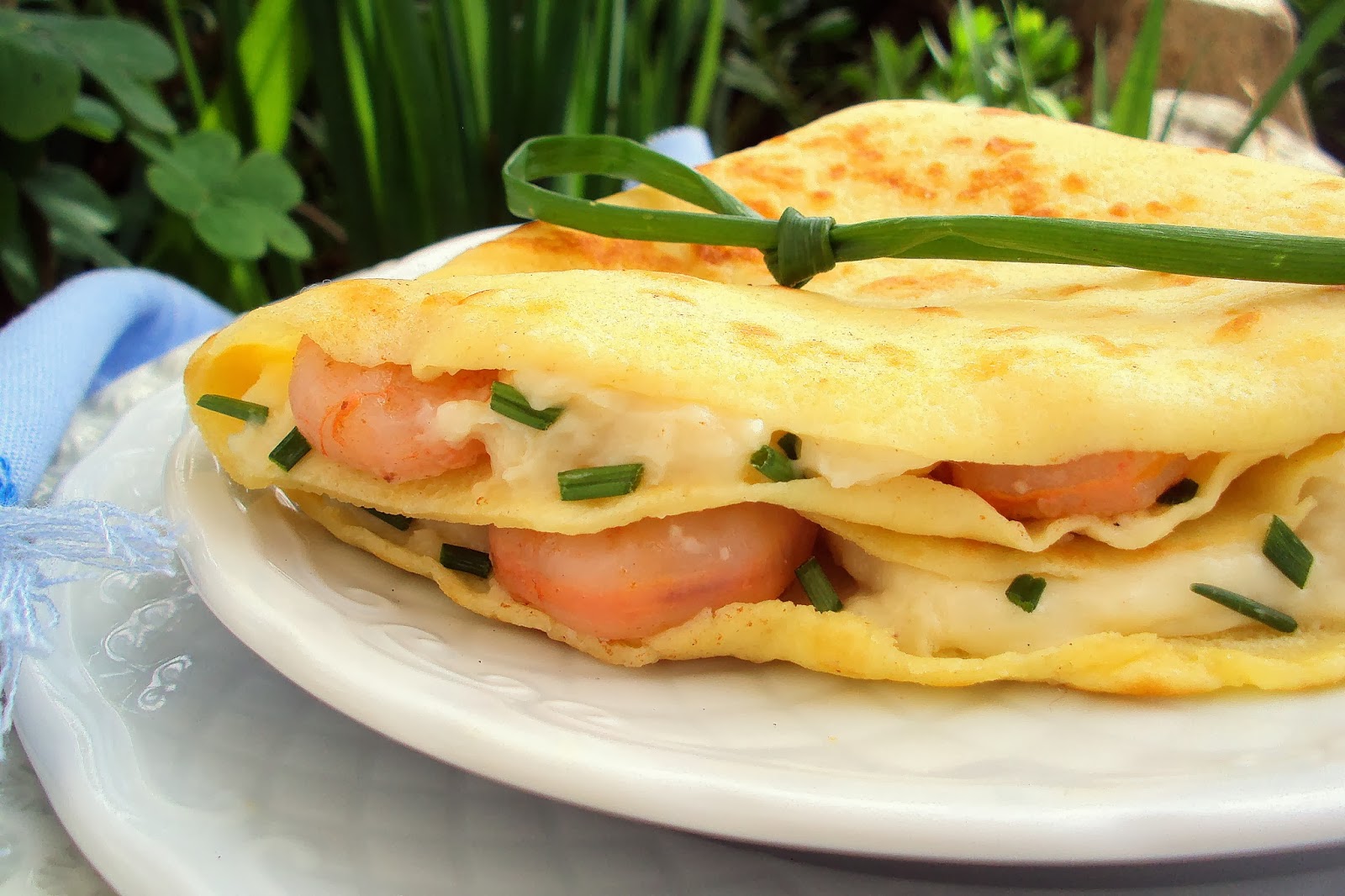 Coloque uma colher de sopa de molho no centro de cada crepe, espalhando-o um pouco no sentido do comprimento. Sobre o molho, adicione os camarões, distribuindo-os bem e polvilhe com um pouco de cebolinho picado. Dobre o crepe ao meio e repita novamente o processo para que este fique em forma de leque. Sirva de imediato.