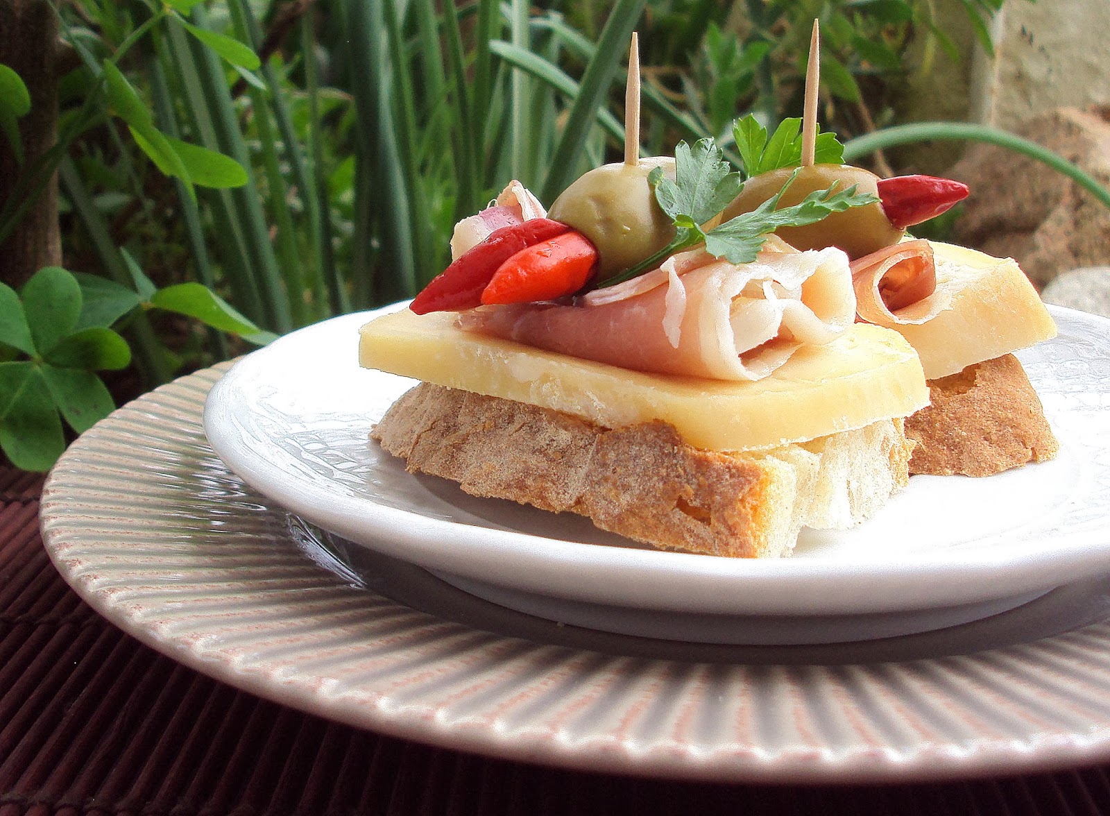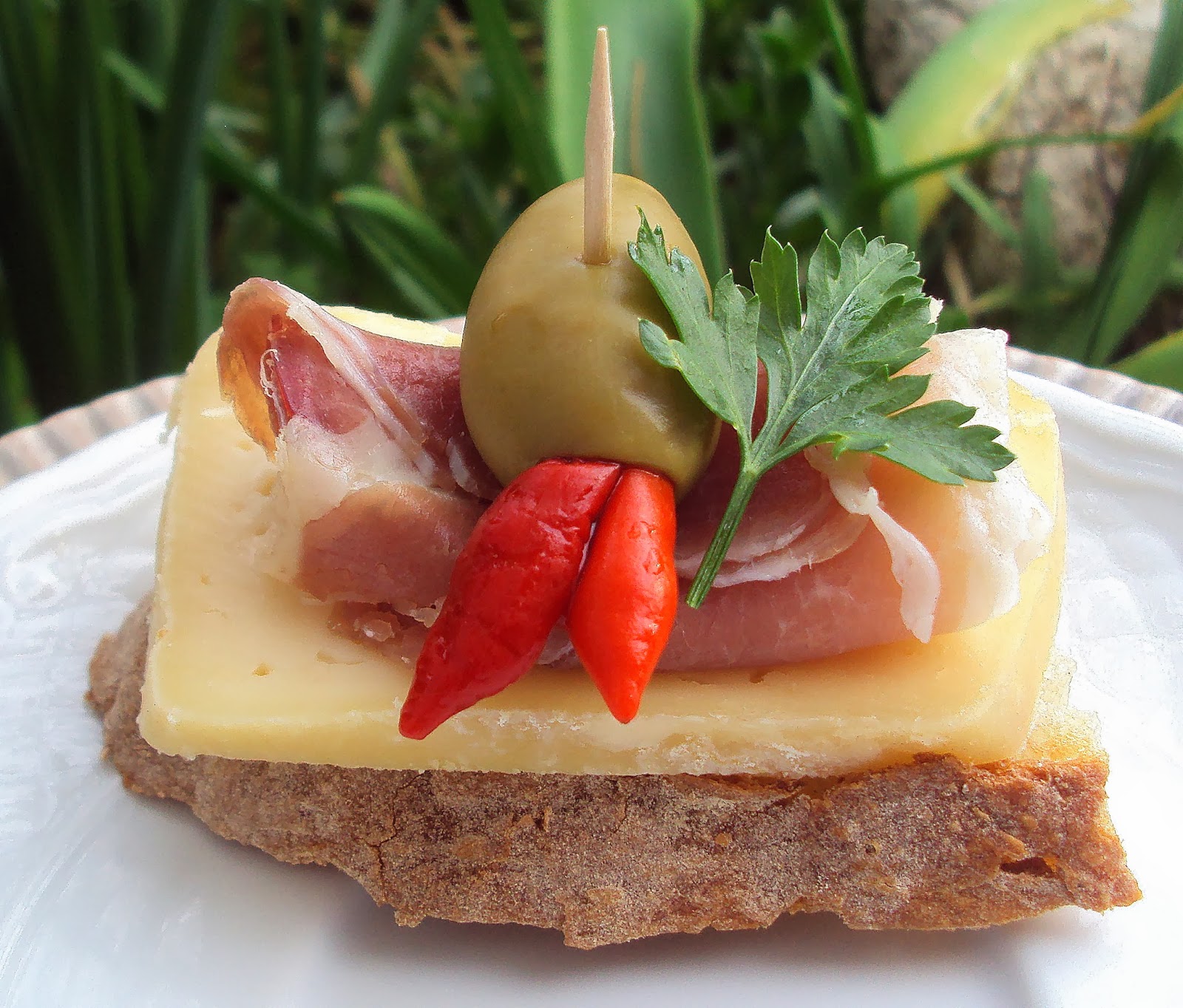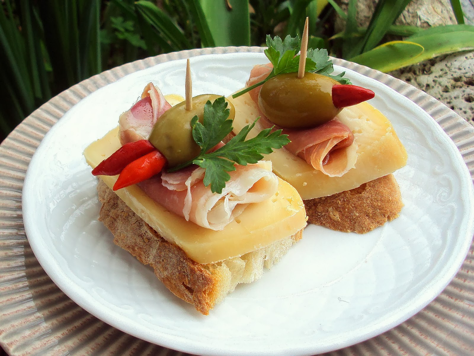 Comece por cortar as fatias de pão em metades e coloque-as numa travessa de servir. Sobre cada uma delas, coloque uma fatia generosa de queijo de Azeitão. Por cima, deve acrescentar o presunto enrolado como se de um charuto se tratasse e deve encimado por uma azeitona recheada com piri-piri. Por fim, deve terminar espetando um palito sobre todos os ingredientes da tapa, prendendo-os, e decorar com folhas de salsa fresca.