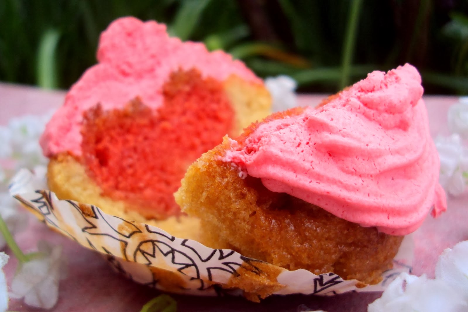 Sobre cada forma de papel, coloque 1.5 colher de sopa de massa clara e nela espete o coração. Coloque mais um pouco de massa mas sem encher a forma (cerca de 3/4 da forma é suficiente). Distribua a restante massa e corações pelas restantes formas, certificando-se que estes ficam mesmo ao centro. Coloque as formas num tabuleiro com todos os corações virados para si e nunca os mude de posição, mesmo depois de estarem cozinhados, pois, deste modo, quando cortar o cupcake a meio ver-se-à o coração.
