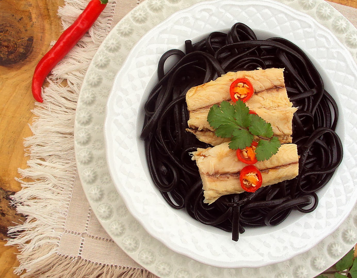 Sobre a massa, coloque os filetes de cavala e regue-os com o restante azeite picante. Sirva com coentros frescos.