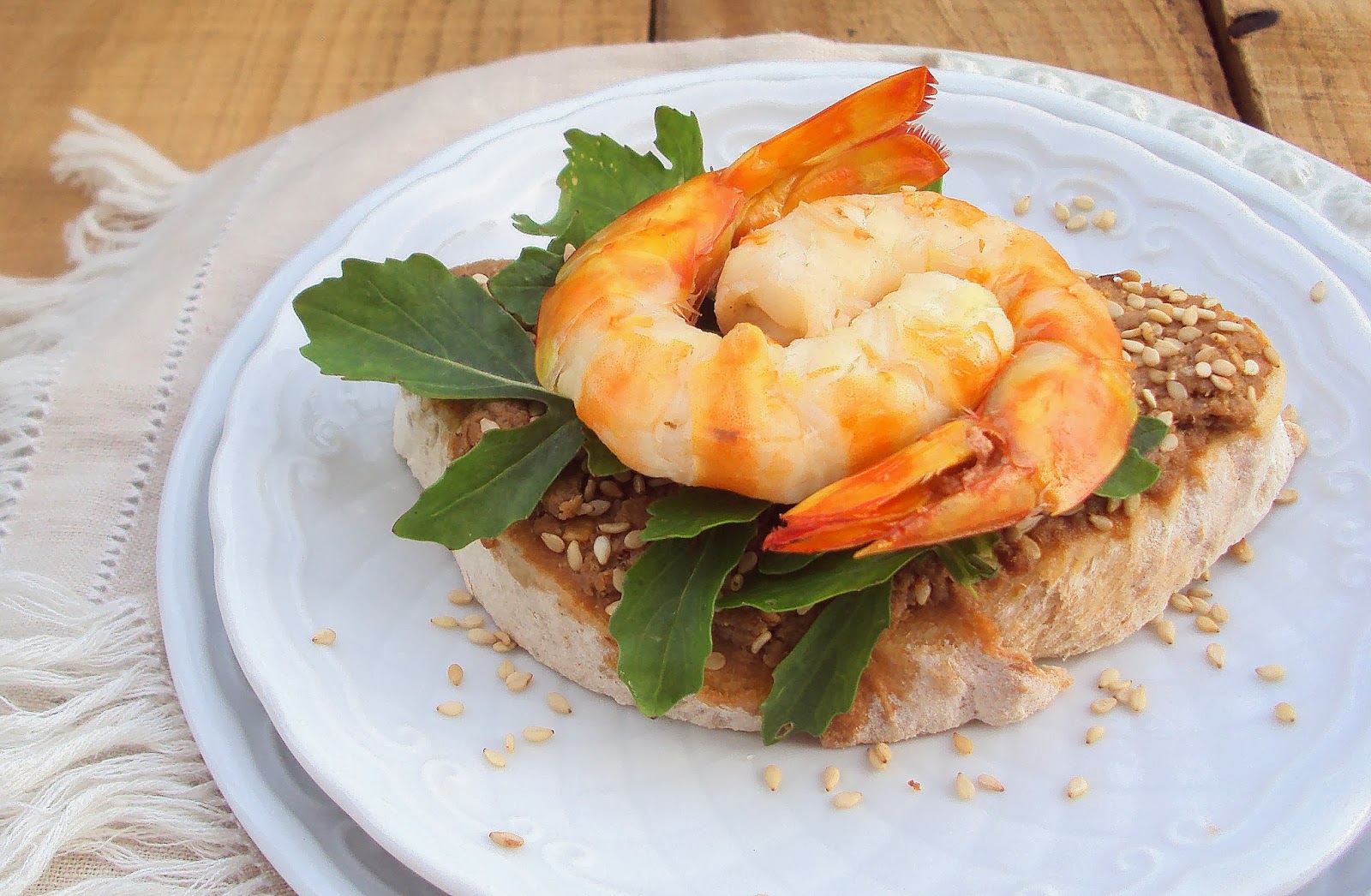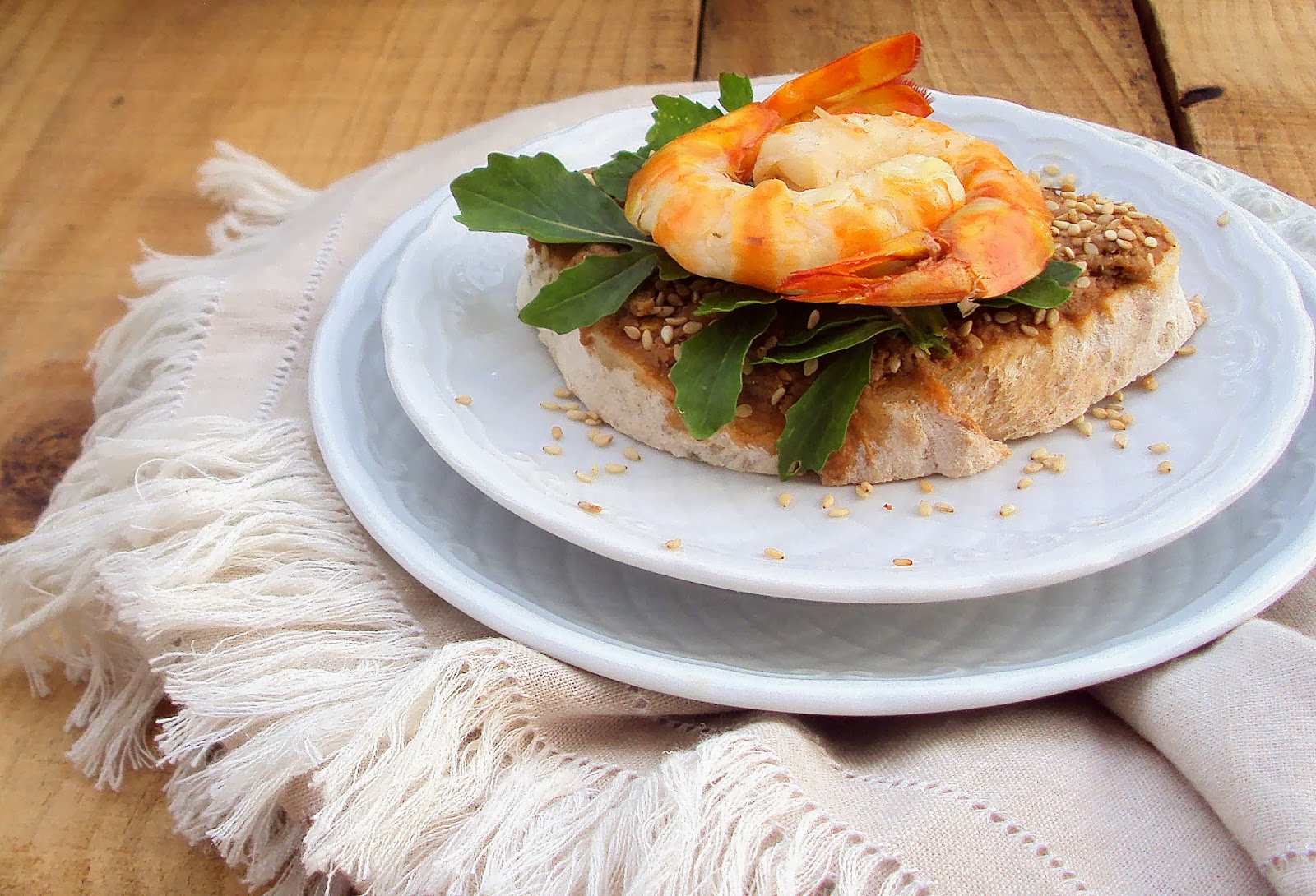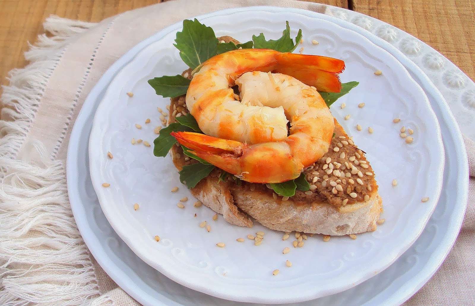 Corte o pão em fatias com 1cm de espessura e barre-o, generosamente, com o paté. Polvilhe com sementes de sésamo e adicione algumas folhas de rúcula. Sobre esta, disponha o camarão temperado e sirva de imediato.