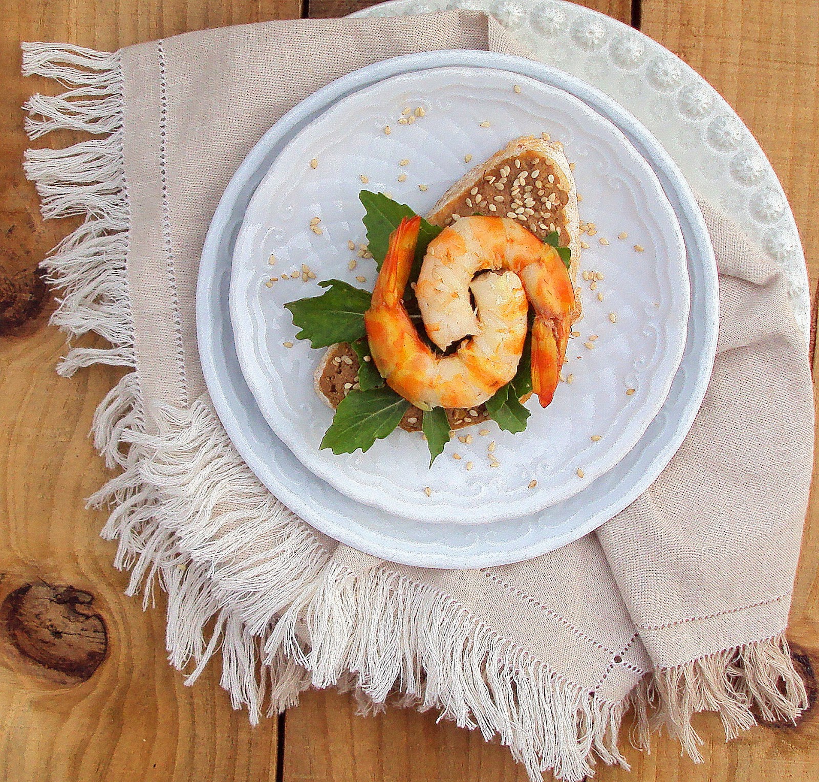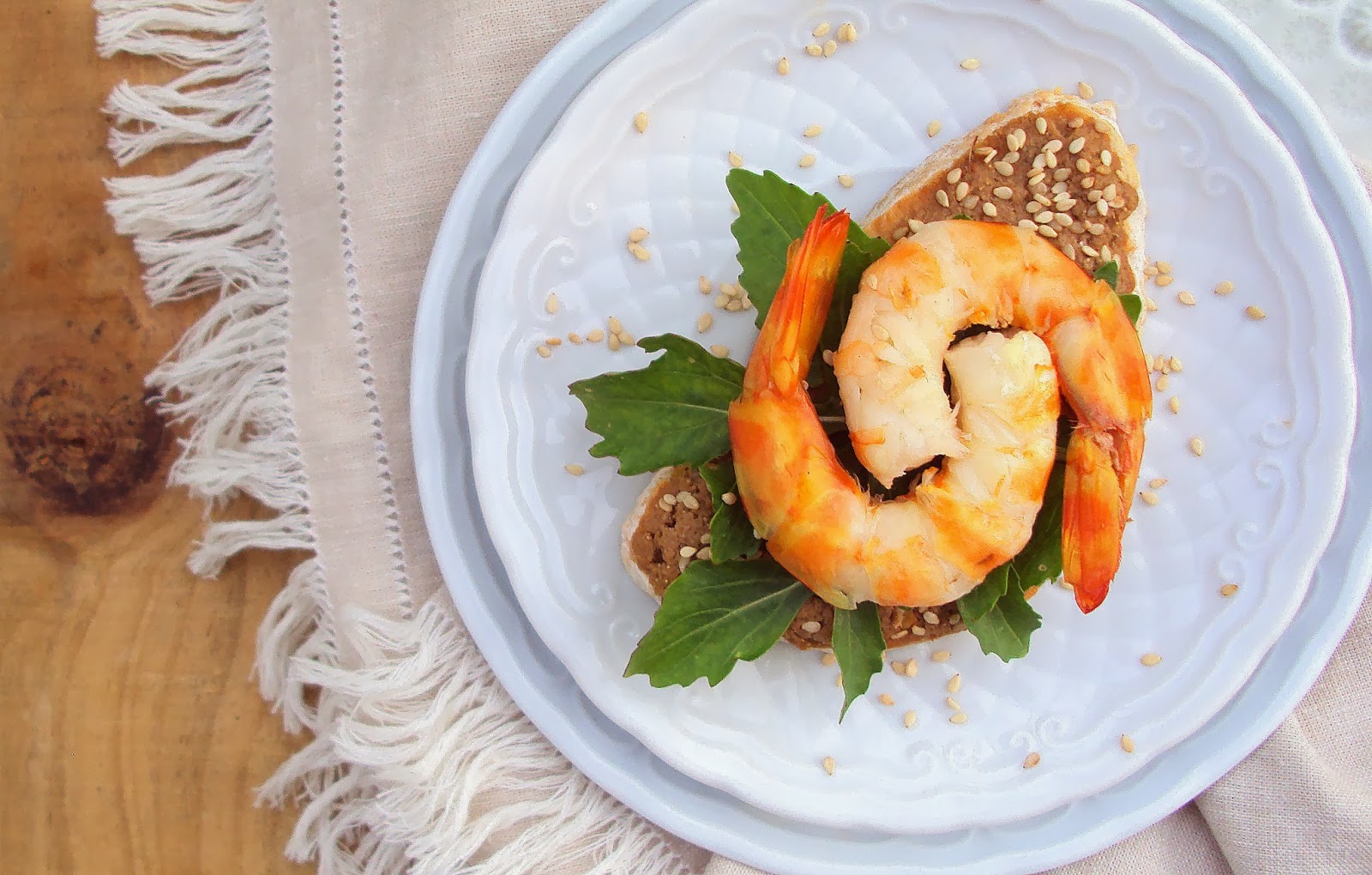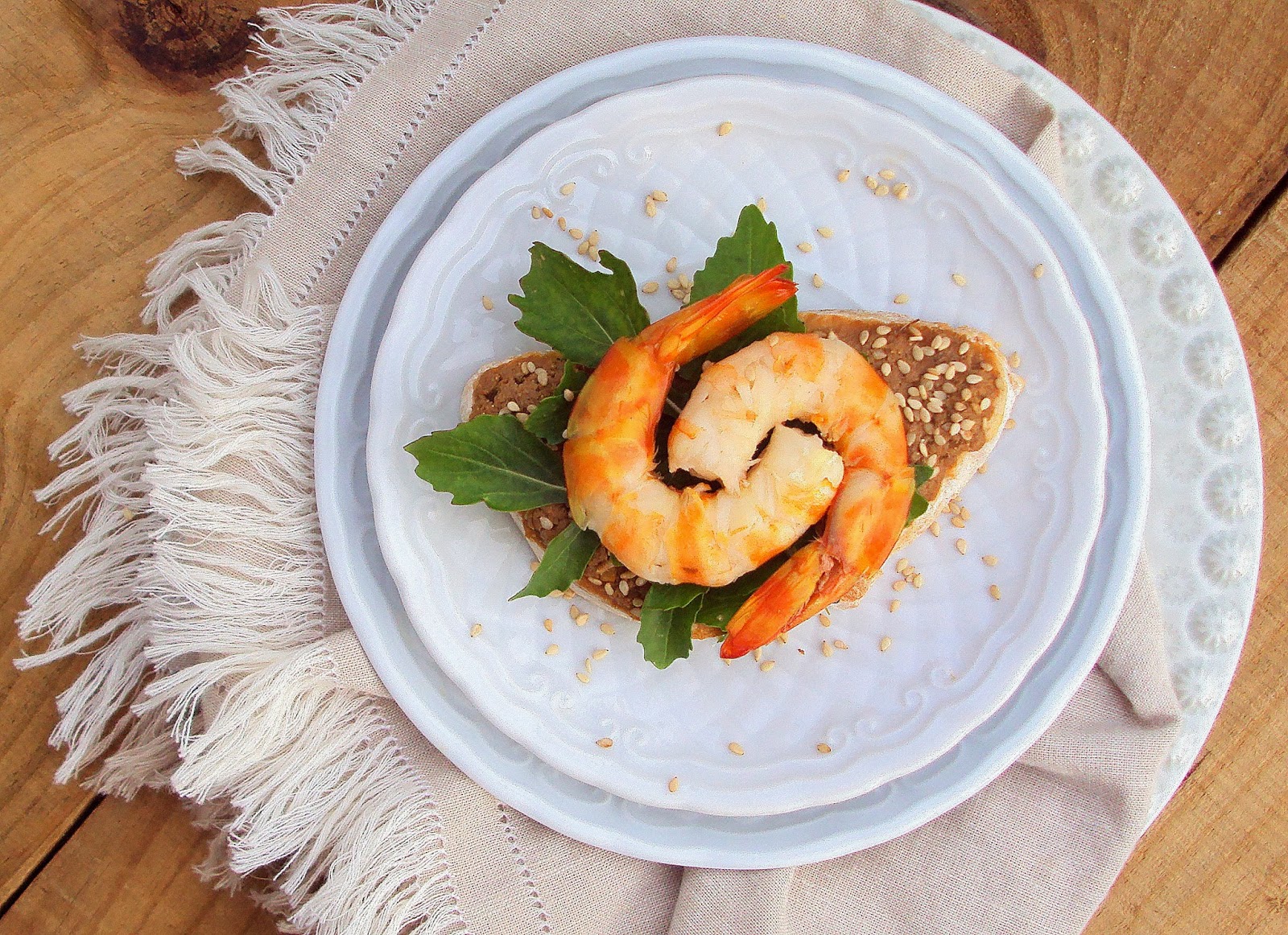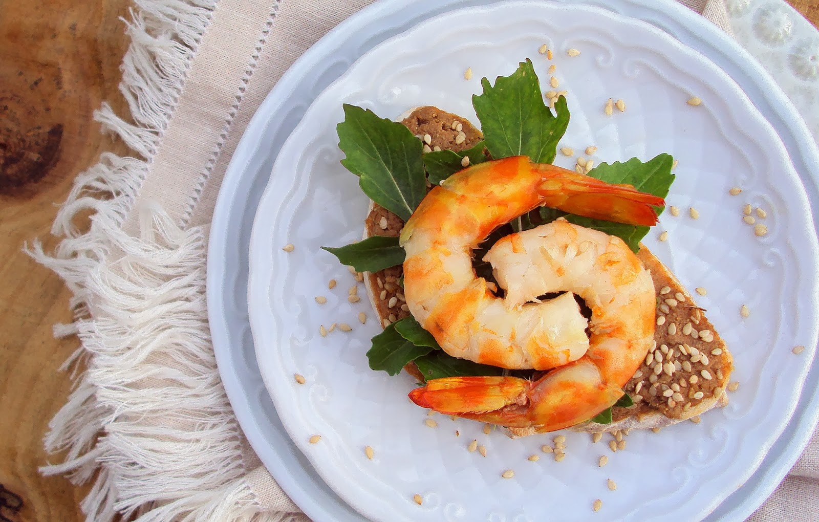 Corte o pão em fatias com 1cm de espessura e barre-o, generosamente, com o paté. Polvilhe com sementes de sésamo e adicione algumas folhas de rúcula. Sobre esta, disponha o camarão temperado e sirva de imediato.