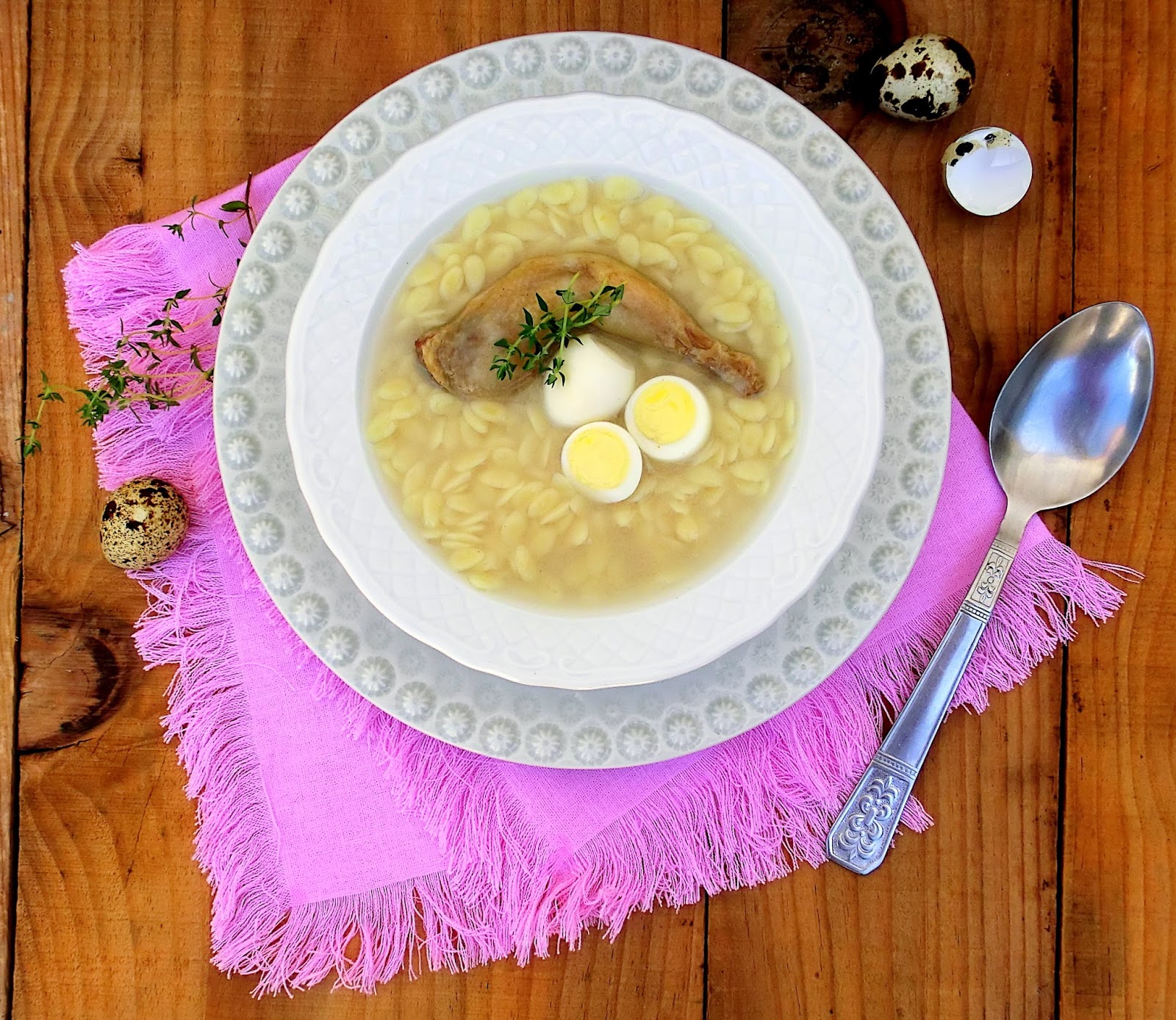 Tempere com pimenta e um pouco de tomilho e deixe a carne cozer em lume médio e, quando esta se encontrar tenra, adicione as massas. Deixe a massa cozer, retifique o sal, junte os ovos de codorniz, previamente cozidos, e adicione mais água, se necessário.