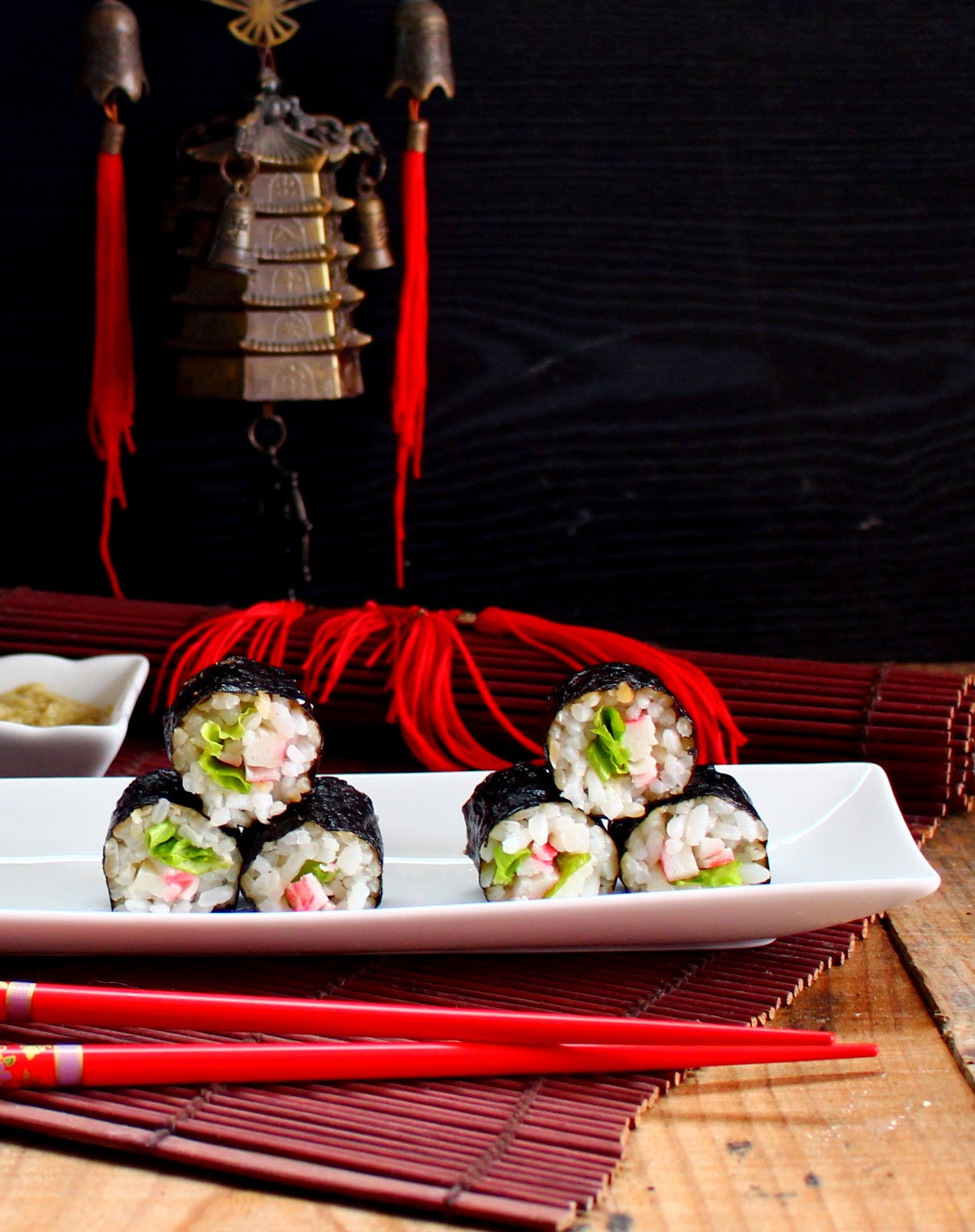 Ao centro do arroz e no sentido do comprimento, adicione tiras finas de alface (ocupando 2/3 do espaço do arroz). Por cima, adicione tirinhas de delícias do mar e barre com maionese. Passe uma pequena quantidade de óleo de sésamo na extremidade da alga que deixou sem arroz.