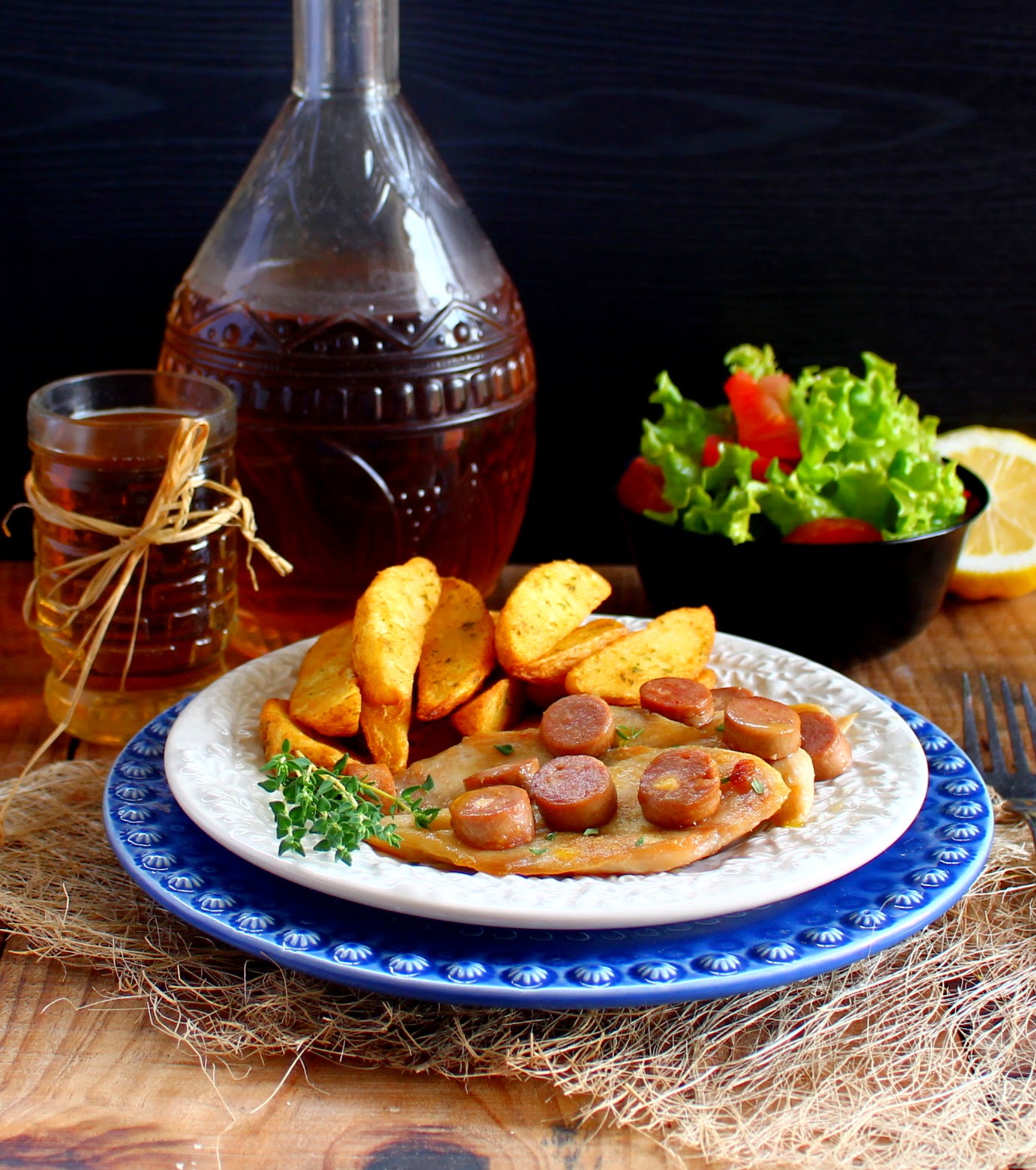 Aqueça o azeite, junte-lhe os dentes de alho laminados e a folha de louro. Acrescente os bifes e frite-os, em lume brando, deixando-os alourar de ambos os lados. Junte as salsichas fatiadas e deixe cozinhar mais um pouco. Junte o vinho branco e, com a colher de pau, dilua os resíduos da da carne. Deixe evaporar um pouco.