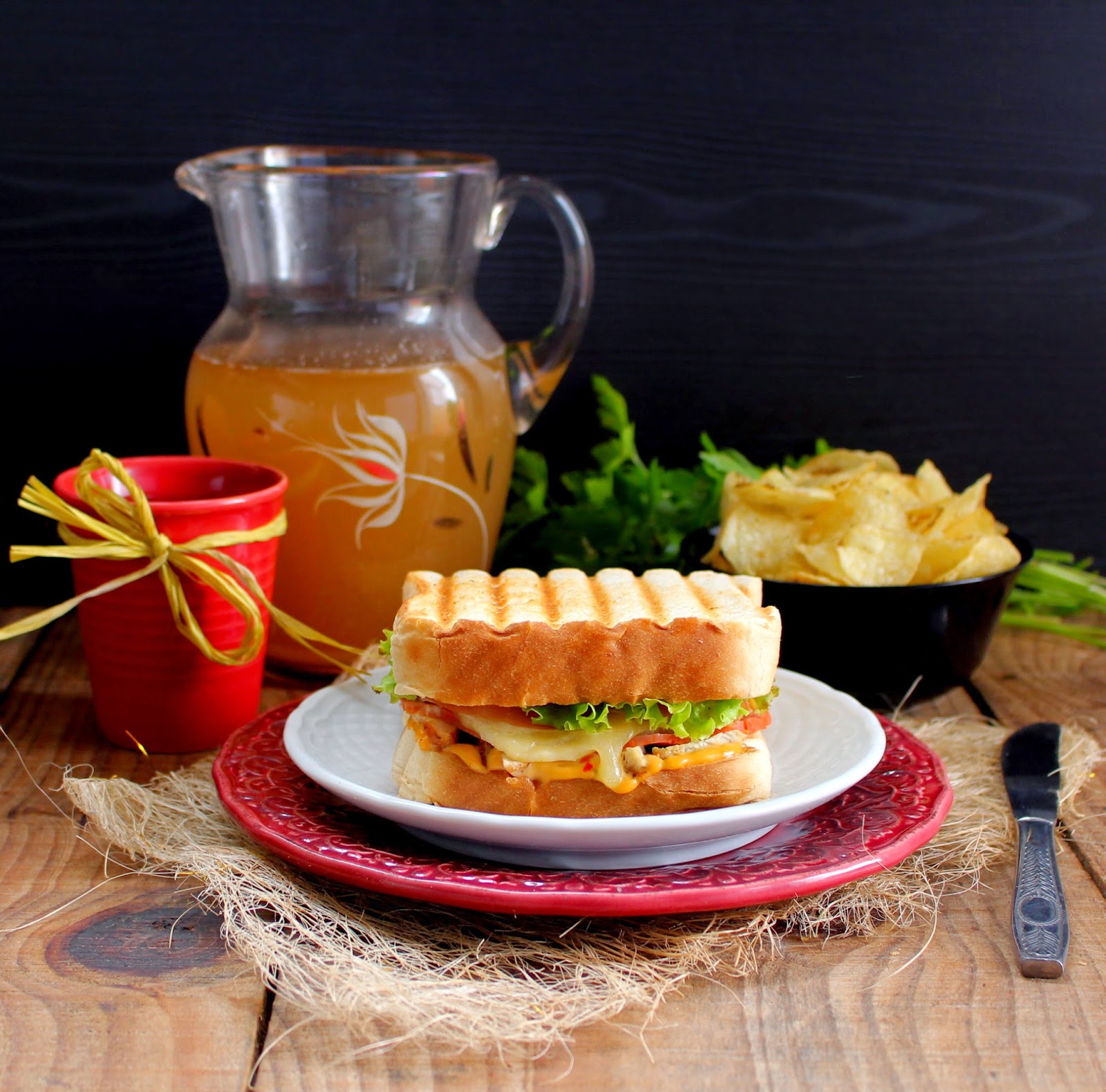 Sobre uma das fatias de pão adicione a mostarda com ananás, depois uma boa porção de frango e o paio york. Acrescente o queijo, o tomate temperado e alface a gosto. Termine com outra fatia de pão e, mantendo a sandes nesta posição, leve-a novamente a torrar. Após algum tempo, levante o pão e verifique se os sulcos (as marcas listradas no pão) estão bem formados, o queijo derretido corretamente, e o pão torrado.