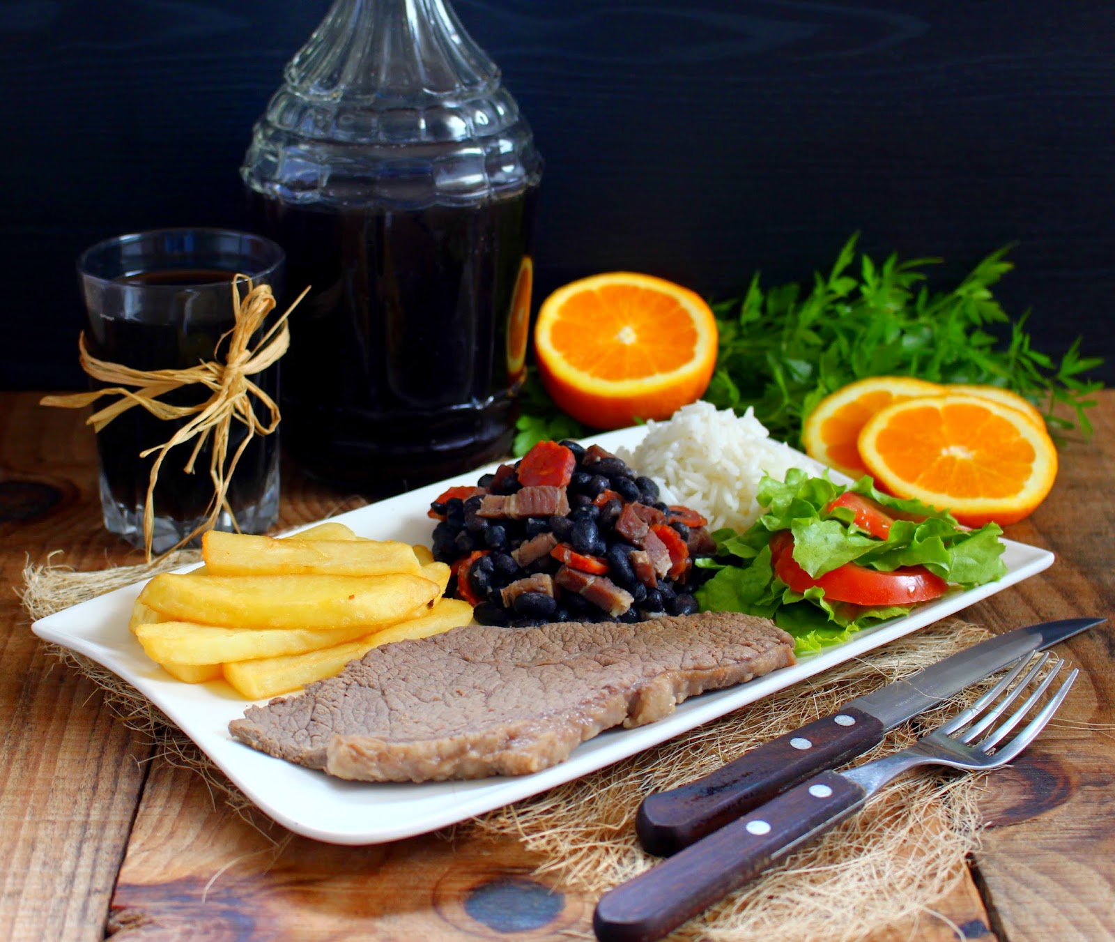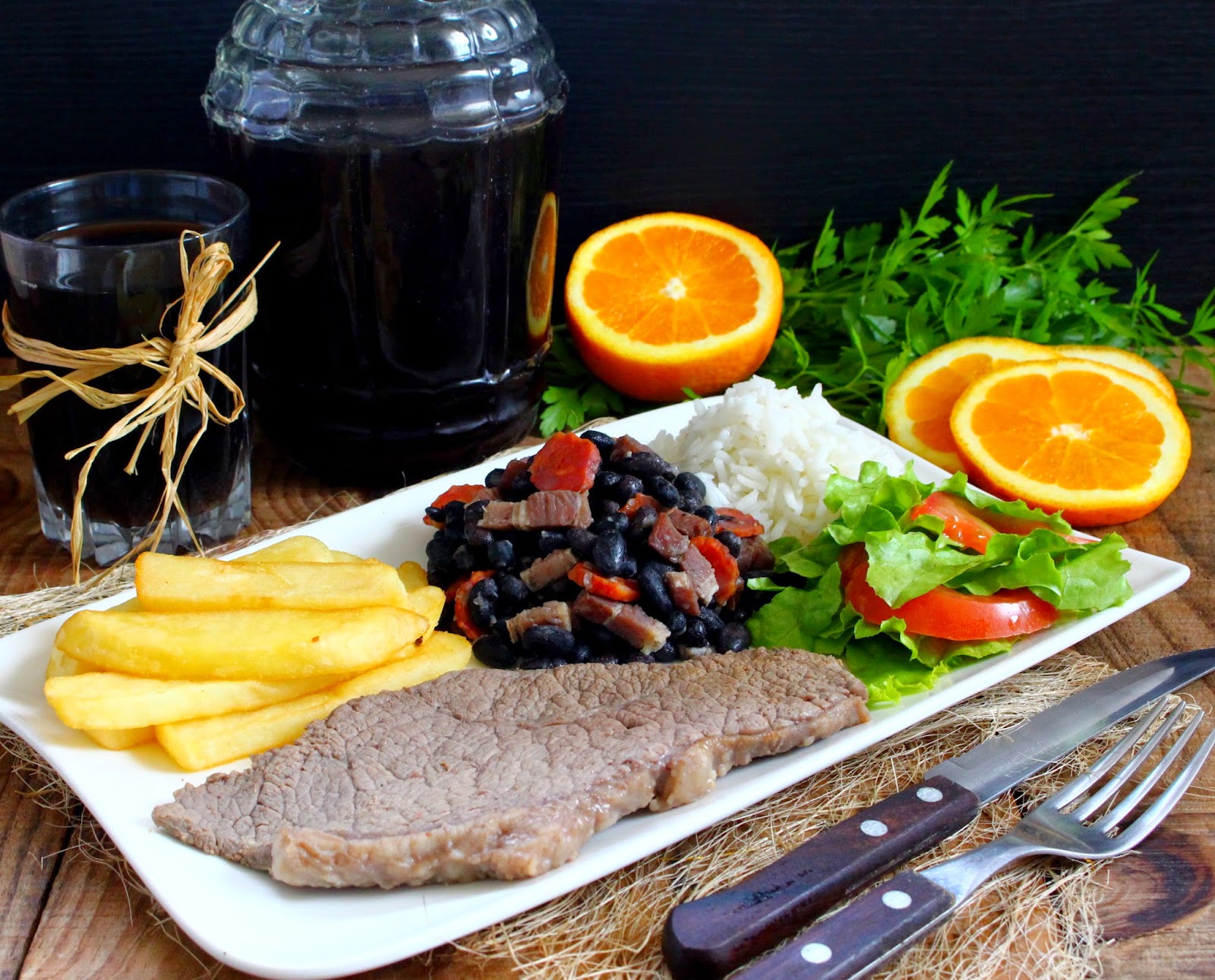 Ao mesmo tempo, frite as batatas, prepare o arroz branco em água fervente temperada de sal e um pedaço de cebola e tempere a salada de alface e tomate.Sirva a picanha acompanhada pelo feijão preto, arroz branco e salada.