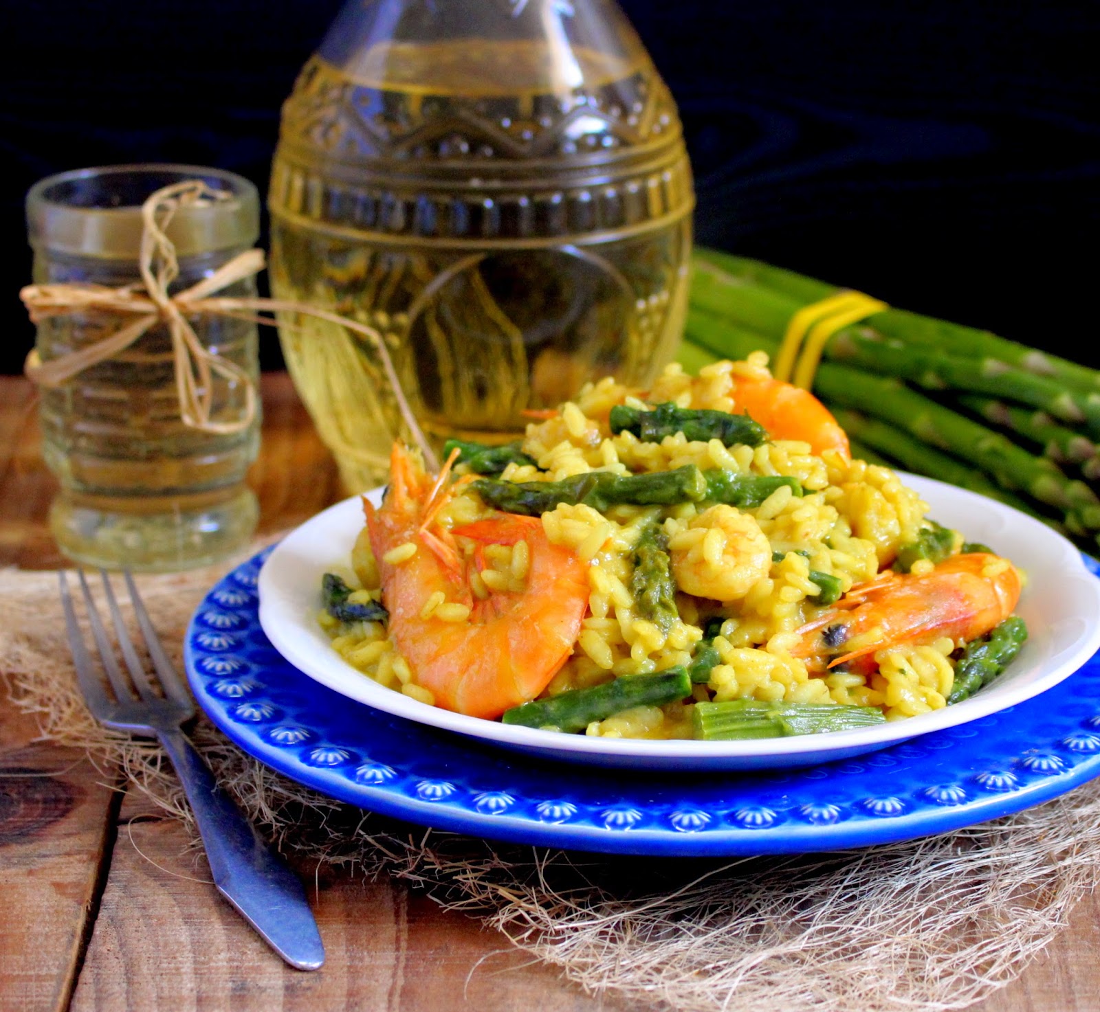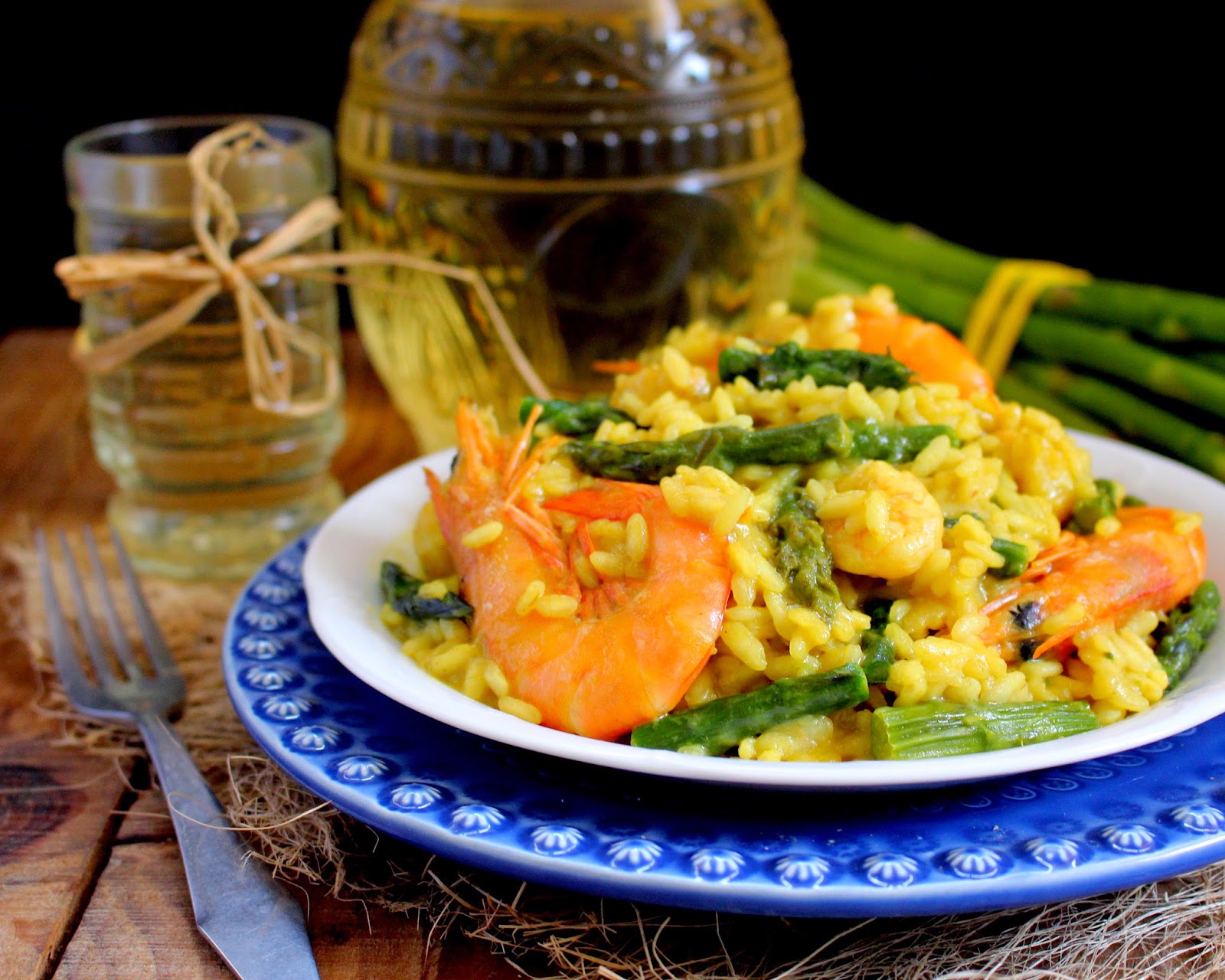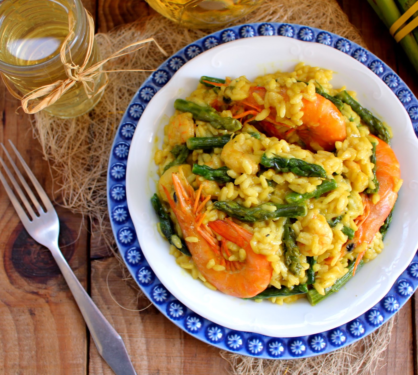 Quando a cebola estiver translucida, junte os espargos (guardando as pontas espigadas) e os camarões inteiros. Deixe refogar um pouco e acrescente o arroz, deixando-o ficar translúcido. Regue-o com o vinho branco e deixe evaporar. Tempere com sal, pimenta e uma pitada de caril.