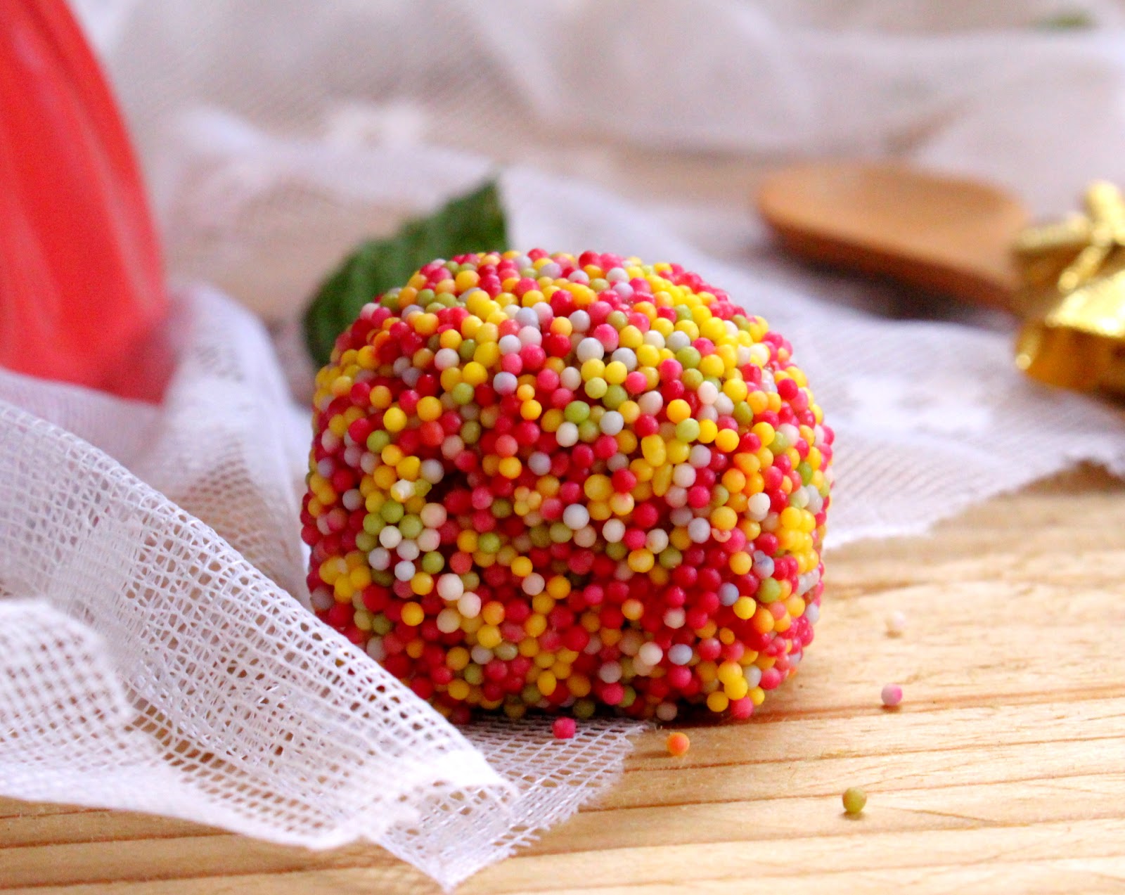 Desenforme, deixe arrefecer e desfaça o bolo em pedaços muito pequenos. Junte-lhe o doce de leite aos poucos e envolva. Molde bolinhas do tamanho de uma nós e passe-as nas pepitas multicolores.