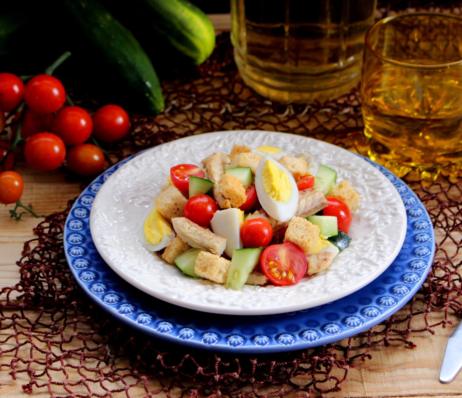 A um prato de servir, adicione os legumes e ovo, junte-lhe os filetes de cavala cortados em pedaços e regue com o azeite da embalagem. Envolva bem, tempere com sal e acrescente os croutons.