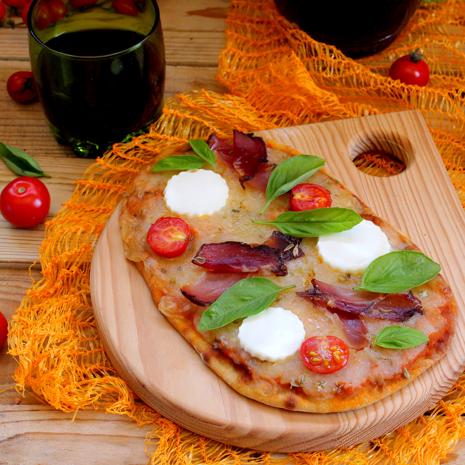 Adicione uma boa porção de molho de tomate a cada uma das bases de pizza, alisando e espalhando-o bem. Rale o queijo e espalhe sobre o molho. Acrescente lascas de cachaço, fatias de queijo fresco e tomate cereja em metades. Por fim, polvilhe com oregãos e leve ao forno pré-aquecido a 200ºC durante 10-15 minutos, aproximadamente, ou até o queijo gratinar e a massa apresentar-se crocante.