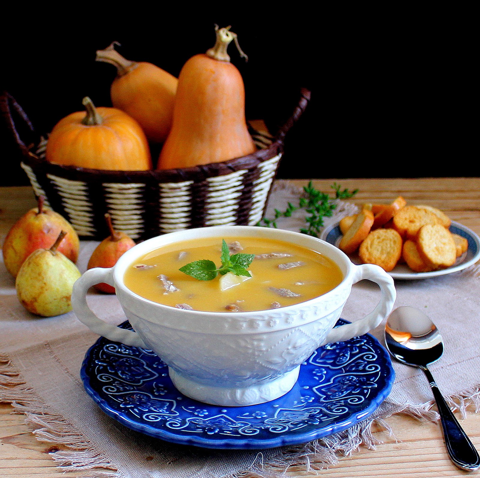 Descarte o osso e reduza a sopa a puré, adicione um fio de azeite, retifique o sal e introduza, novamente, a carne que reservou e a restante pêra em pequenos pedaços. Leve a ferver por 2-3 minutos e sirva acompanhado de biscottinas redondas com azeite e sal.
