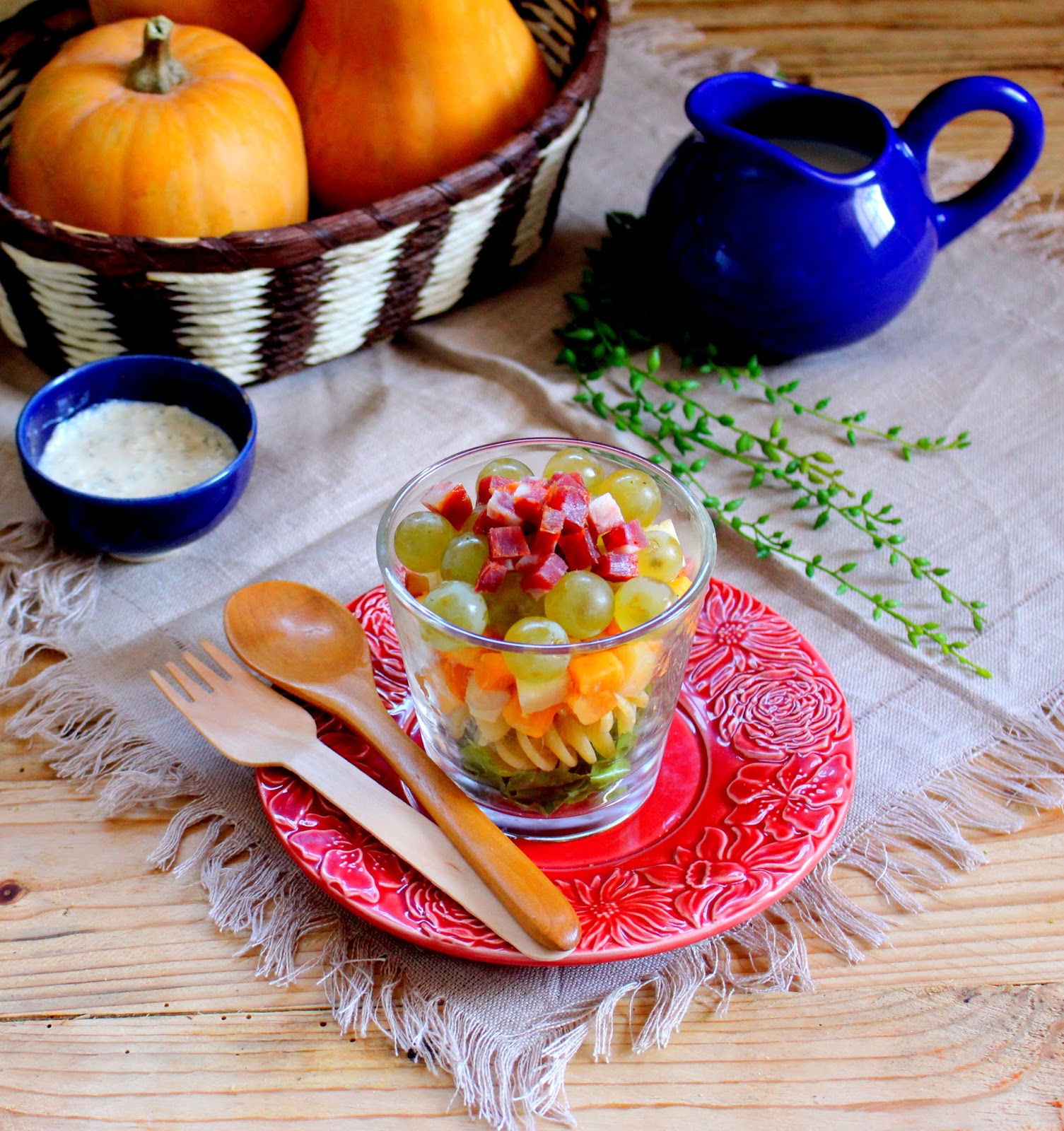 Em taças/copos de vidro a adicione uma porção de alface cortada em pedaços pequenos. Faça, de seguida, uma camada com massa e outra com as mistura dos dois queijos. Por fim, faça uma camada de uvas e outra com o painho.