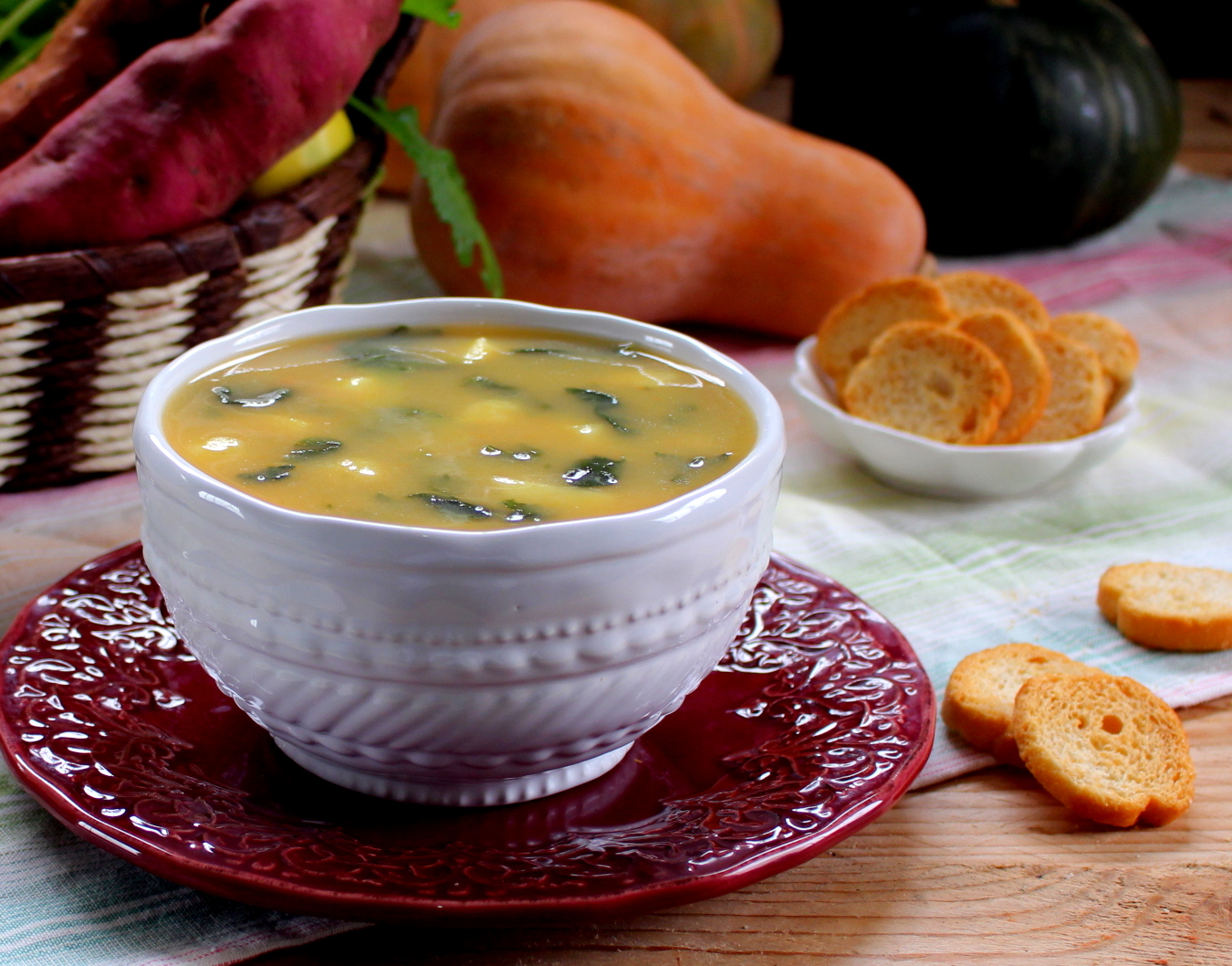 Coloque a água para ferver, temperada com sal, e adicione-lhe a cebola, a courgete, a abóbora, as batatas branca e doce (reservando 150 g de batata doce), e os alhos descascados. Deixe cozer cerca de 20 minutos e reduza tudo a puré com a varinha mágica.
