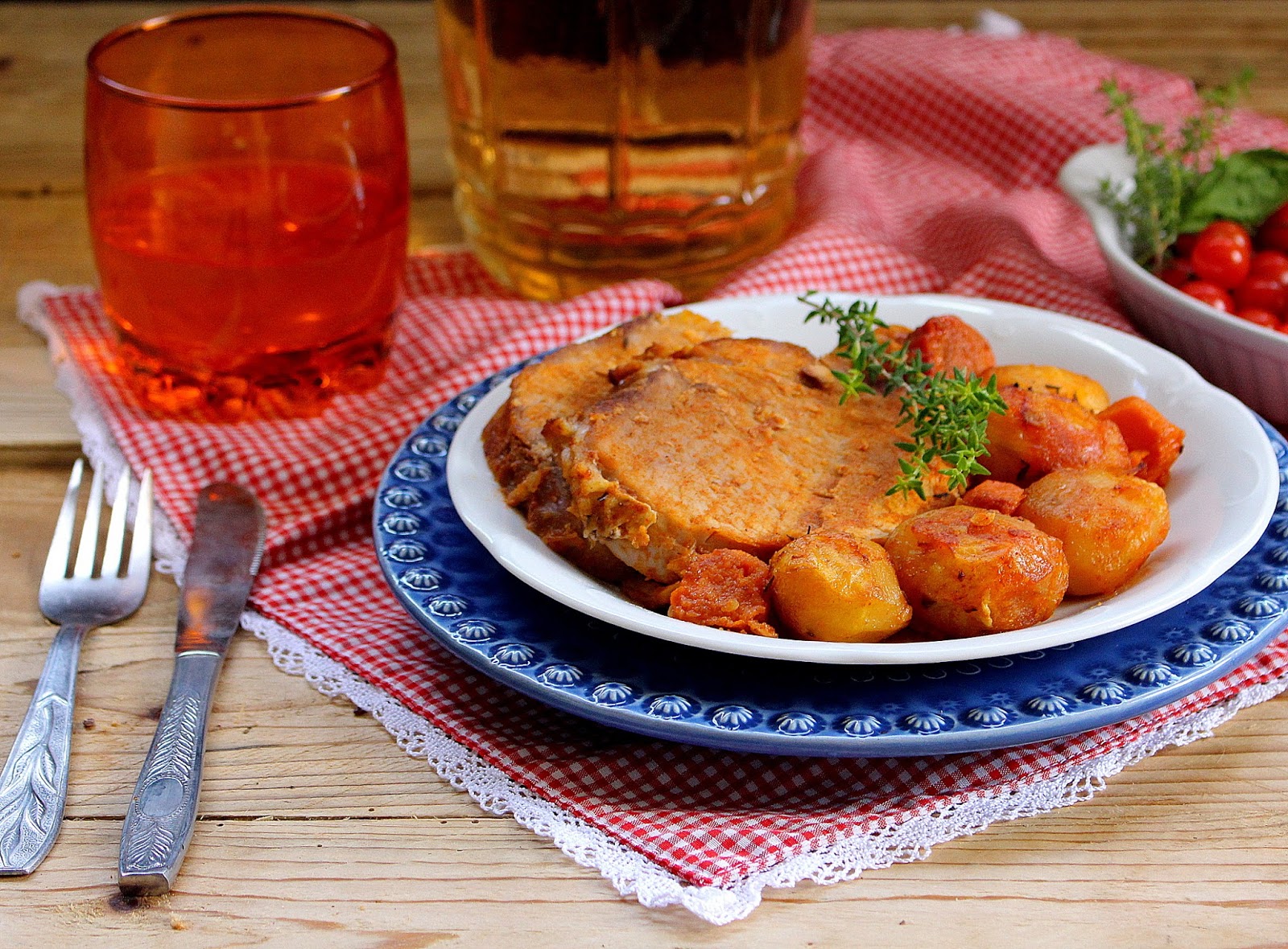 Sirva o lombo de porco fatiado, com a mistura de batatas e cenouras e regue com o molho do assado.