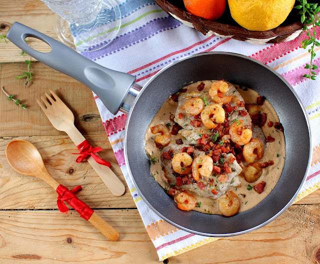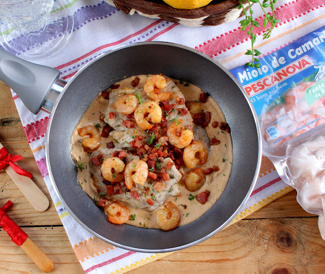 Adicione, à mesma frigideira, o o bacon e o miolo de camarão, deixando cozinhar por um minuto. Tempere com um pouco de sal e metade do tomilho.