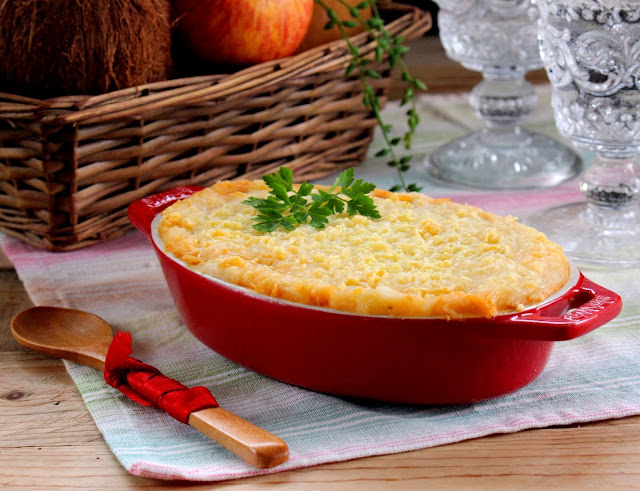 Faça uma camada de puré num tabuleiro/travessa, de ir ao forno, e adicione o strogonoff. Cubra com o restante puré, alise a superfície e polvilhe com o queijo picado grosseiramente.