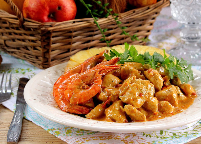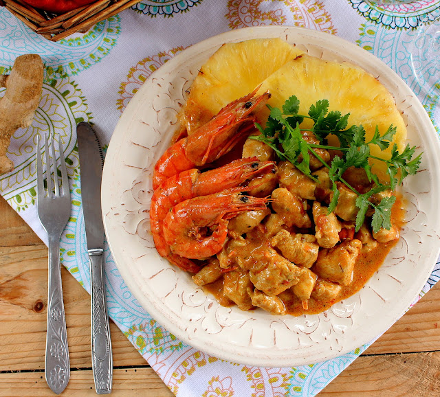 Sirva o com rodelas de abacaxi e polvilhado com coentros, acompanhe com o arroz basmati.