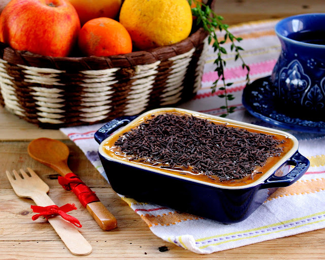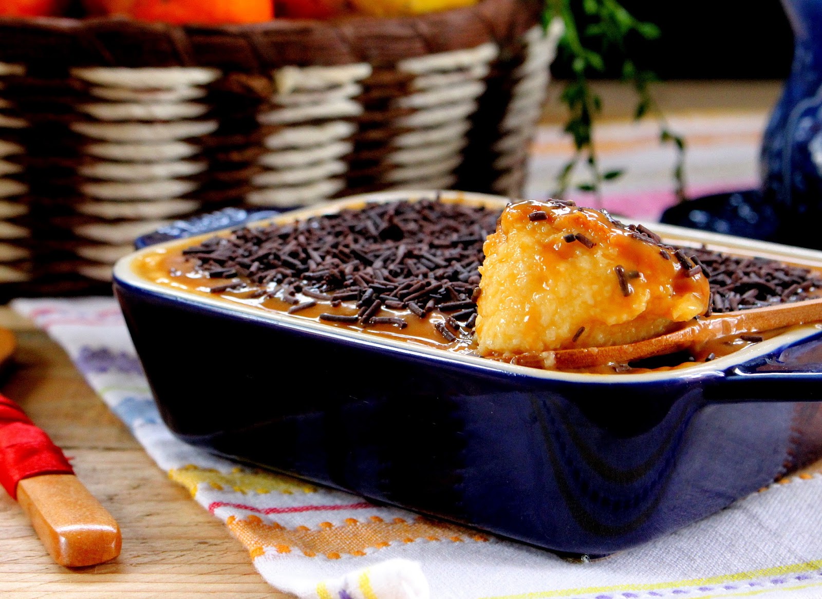 Regue com o caramelo e deixe-o arrefecer completamente. Polvilhe com o granulado de chocolate e sirva.