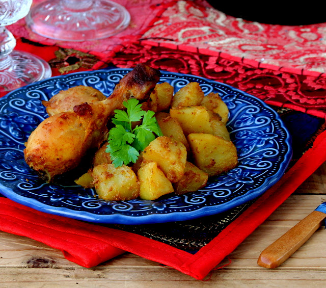 Coloque o frango e as batatas num tabuleiro de ir ao forno e verta o molho reservado sobre ambos. Envolva bem e leve ao forno durante 40 minutos até que tanto o frango como as batatas estejam assados.