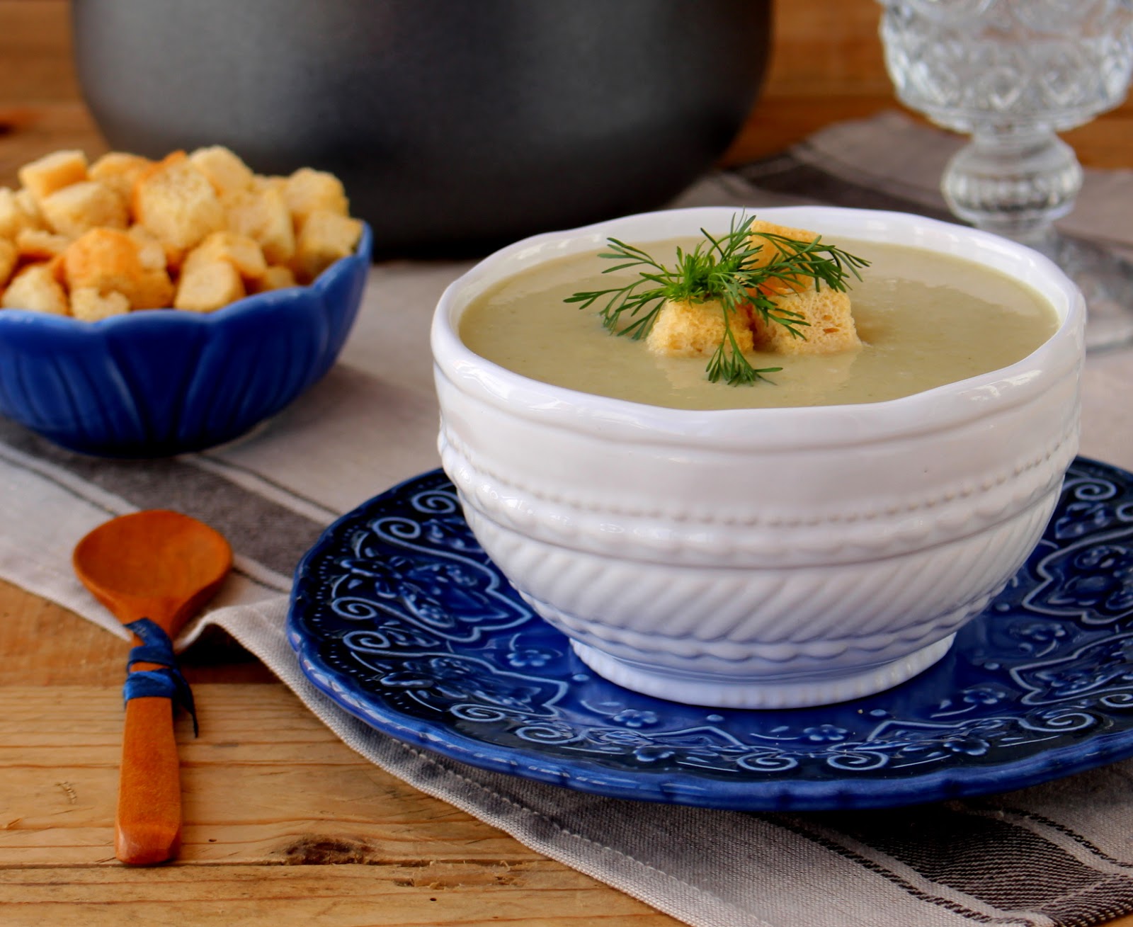Adicione os brócolos em pedaços pequenos, mexa, salteando-os um pouco e regue com o leite e com a água. Tempere com sal e pimenta e junte o cubo de caldo de galinha. Deixe cozer, em lume médio, cerca de 30 minutos ou até que os brócolos estejam tenros. Se necessário, junte mais um pouco de água e, logo em seguida, reduza a puré com a varinha mágica. Retifique os temperos e sirva com croutons.