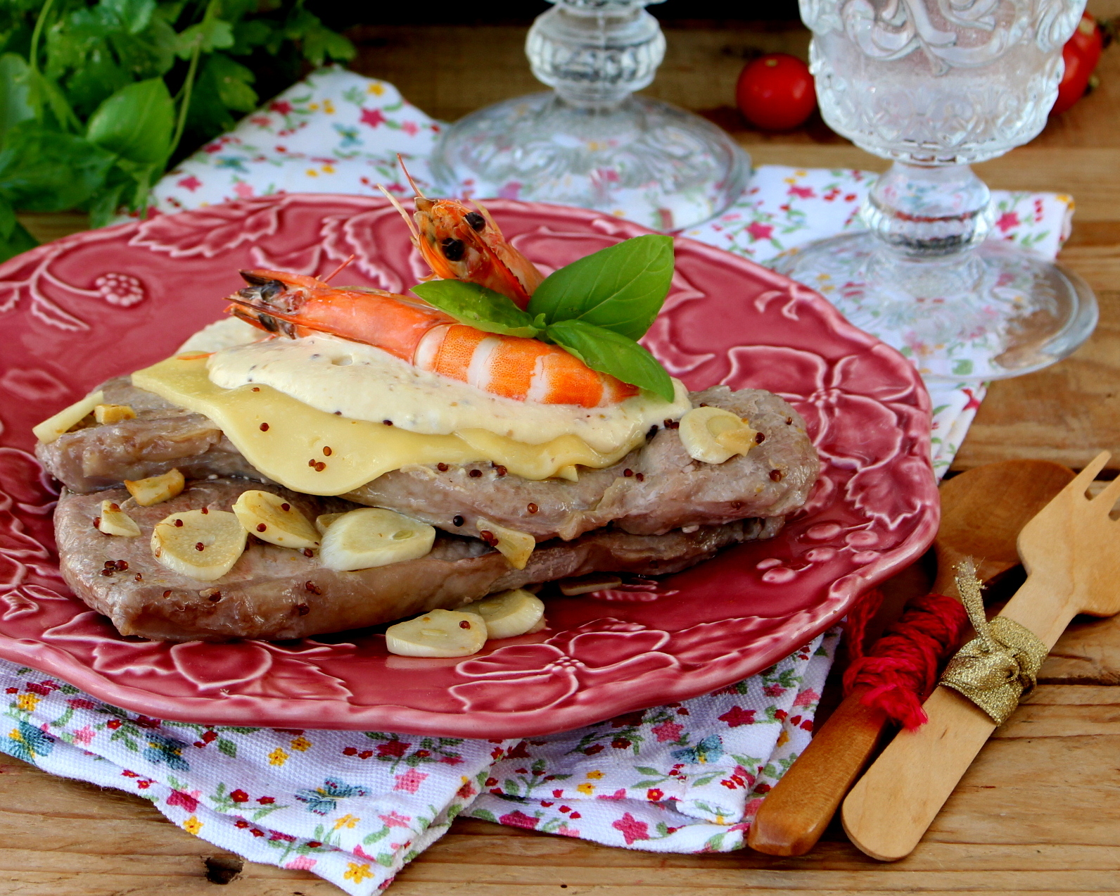 Regue os bifes com queijo com o molho preparado e termine adicionando as gambas.