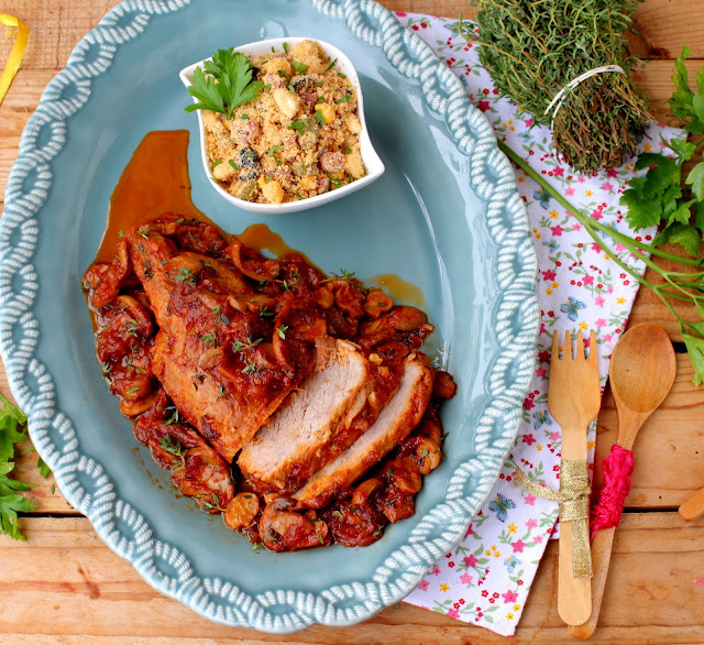 Sirva a carne fatiada com o molho de sidra e cogumelos e acompanhe com a farofa.