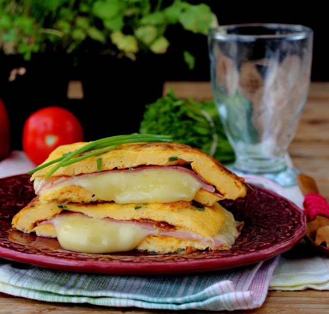 Aqueça um fio de azeite num frigideira larga e junte-lhe metade do preparado de ovo. Tape e deixe cozinhar até que a omelete solidifique. Vire-a e cozinhe-a do outro lado. adicione as fatias de fiambre, tapando toda a área da omelete e cubra queijo fatiado, dobre a meio, cozinhe mais um pouco e retire-a para um prato.