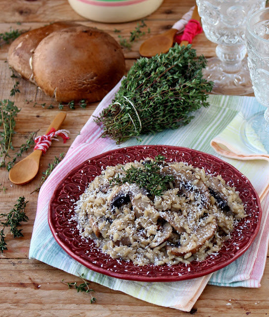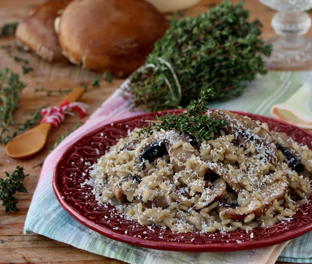 Regue com o vinho branco, deixe-o evaporar e adicione, o tomilho e o caldo de carne, aos poucos (adicione-o, concha por concha, e à medida que ele vai pedindo mais, mexendo, sem parar, até o arroz ficar al dente). Quando já tiver adicionado um quarto do caldo de carne, acrescente os cogumelos e deixe cozinhar, juntando o restante caldo. Retifique o sal e tempere com pimenta.