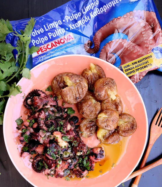 Sirva o polvo, polvilhado com um pouco mais de coentros e salsa, picados, e acompanhe com as batatas a murro, regadas com o molho de azeite.