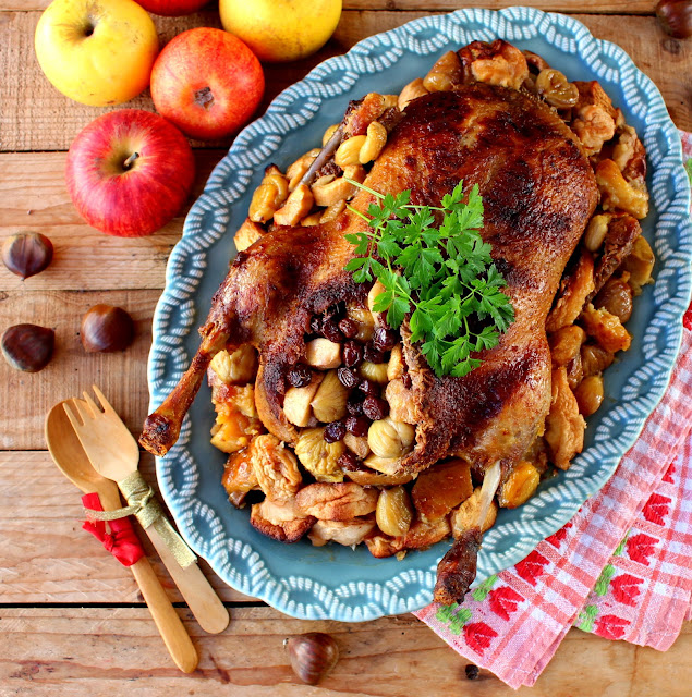 Descasque as maçãs, corte-as em gomos médios e junte-as com as castanhas descascadas. Recheie o pato com elas e vá juntando as passas que demolhou, usando-as todas. Assim que o pato já estiver completamente recheado, coza-o com agulha e linha de cozinha para que o recheio não saia.