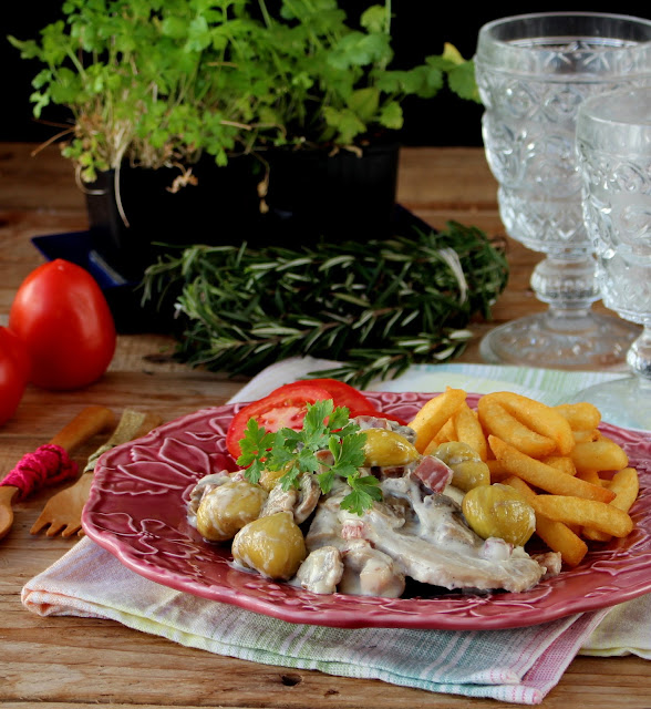 Deixe cozinhar até que as castanhas se encontrem tenras e acrescente as natas. Volte a retificar os temperos e cozinhe mais um pouco para o molho engrossar.
