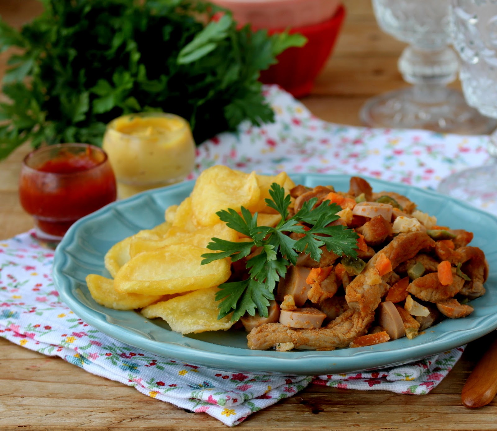 Acompanhe com batatas em palitos feitas no forno levando-as a 200ºC até dourarem.