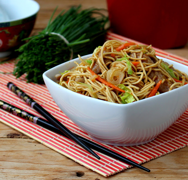 Enquanto isto, aqueça água e, quando ferver, apague o lume e junte-lhe os noodles. Deixe-os repousar, tapados, por 5 minutos. Junte a massa à mistura de carne e legumes e regue com o molho que preparou- Cozinhe até que tanto a carne como os legumes estejam tenros.