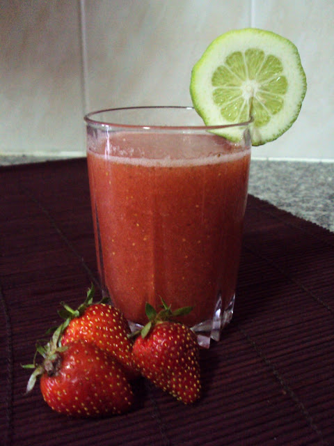 Coloque a polpa de morangos num jarro grande, junte o sumo de 1 limão médio e a vodka. Misture tudo muito bem e acrescente o gelo picado. Torne a mexer e sirva em copos, decorados com uma rodela de lima/limão.