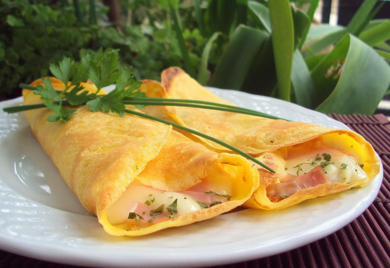 Coloque uma colher de sopa de molho no centro de cada crepe, espalhando-o um pouco no sentido do comprimento. Sobre o molho adicione o queijo e fiambre previamente cortados em pedaços pequenos. Polvilhe com mais um pouco de salsa seca, enrole como se fosse um charuto e transfira-os para um tabuleiro.