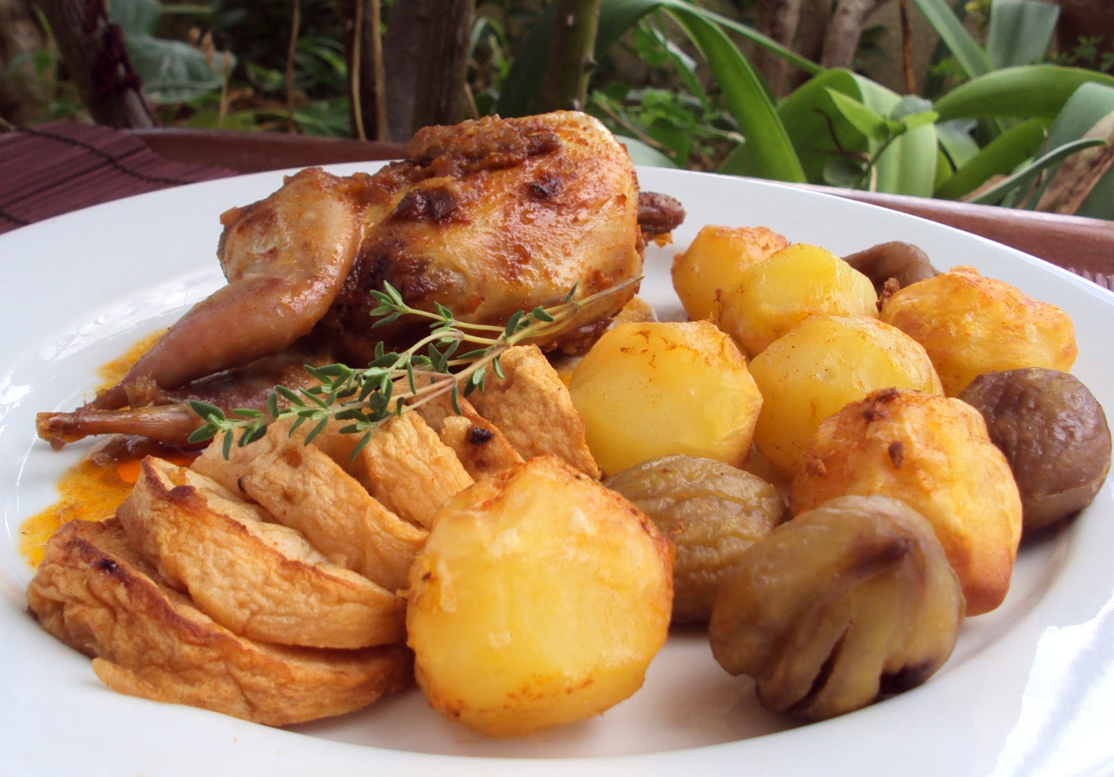Num recipiente junte a maçã em pedacinhos, as passas e 5-6 castanhas em pedaços, envolvendo bem. Recheie as codornizes com este preparado e, por fim, coza-as bem com uma linha. Disponha-as ao centro de um refractário, umas ao lado das outras. Em torno destas, disponha as batatinhas.
