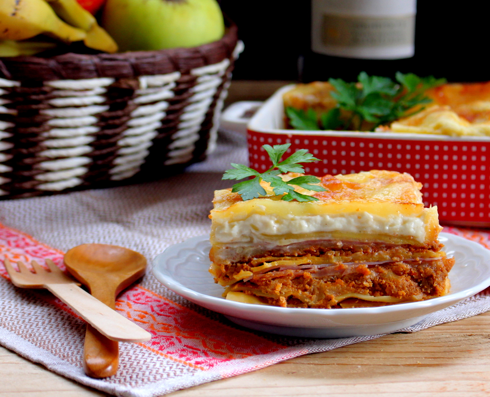 No fundo de um refratário retangular, comece por adicionar 1/3 do molho branco. Cubra-o com placas de lasanha e forre-as com uma boa camada de carne. Acrescente uma camada de queijo, outra de fiambre e adicione mais uma massa. Repita a operação as vezes que desejar até terminar os ingredientes (reserve um pouco do queijo), sendo a última camada de placas de lasanha.